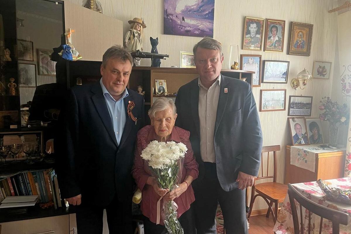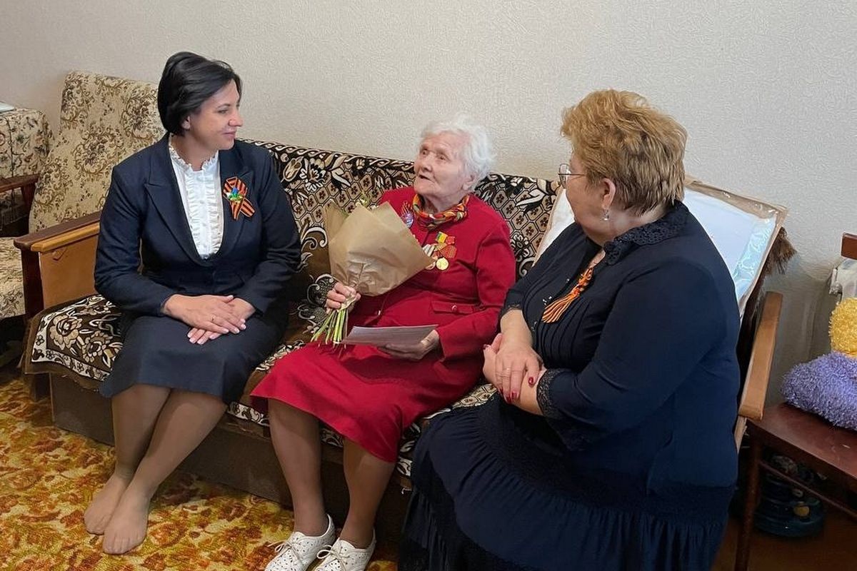 С наступающим Днём Победы труженицу тыла Нину Гордеевну Кашину поздравила депутат заксобрания Наталья Иванова. Парламентарий вручила ветерану цветы и подарки.