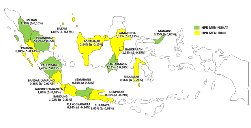 Среди городов наиболее заметное снижение темпов роста зафиксировано в Самаринде (0,18% против 2,36%), главном городе острова Бали Денпасаре (0,90% против 1,79%), Паданге (0,84% против 1,28%) и Батаме (1,84% против 2,41%).