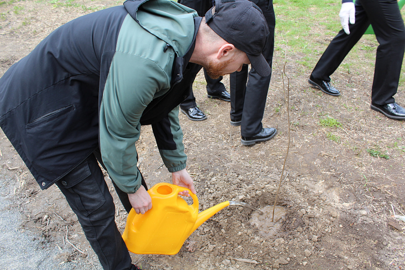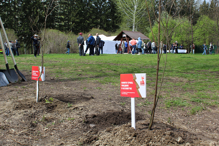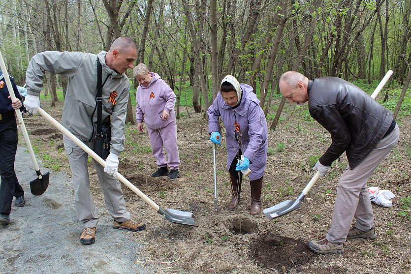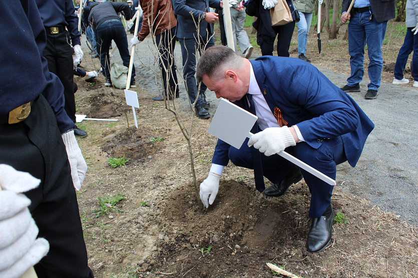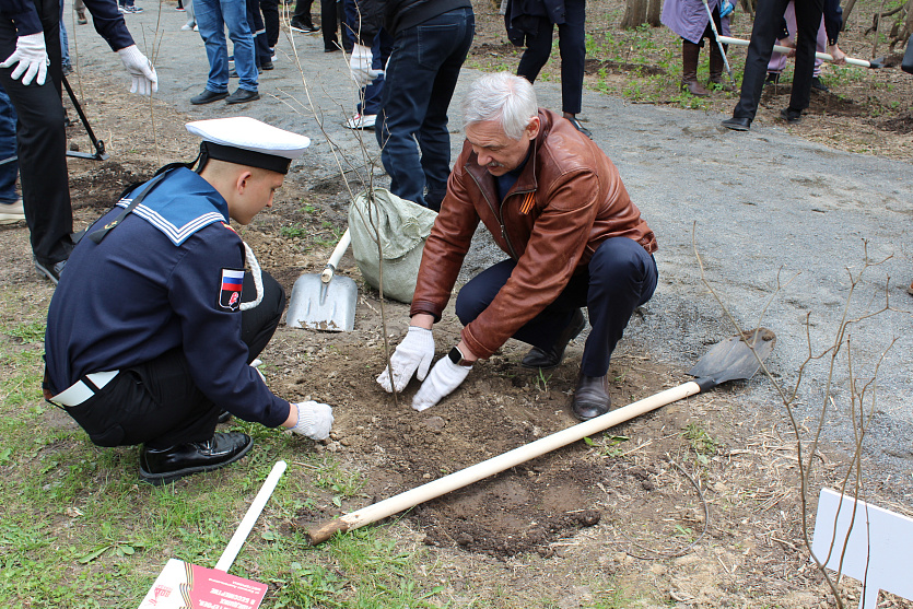 Сотрудники завода «Сибстекло», ветераны тыла, курсанты Юнармии и морского центра «Каравелла» высадили 80 кустов и установили памятный знак.