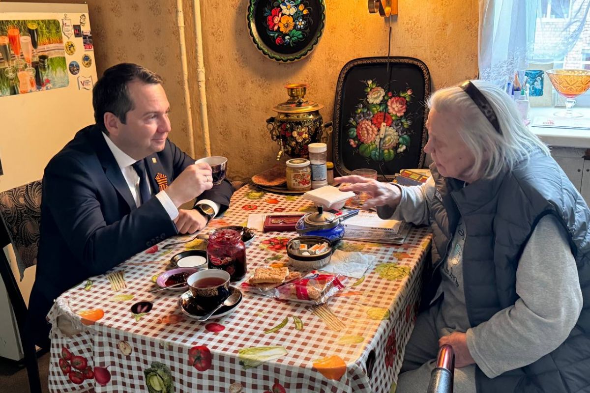 Депутат Госдумы Татьяна Буцкая и депутат Мосгордумы Майя Булаева вместе с ветераном СВО Рустамом Зиганшиным посетили 98-летнего ветерана Григория Федосеевича Стародубцева.