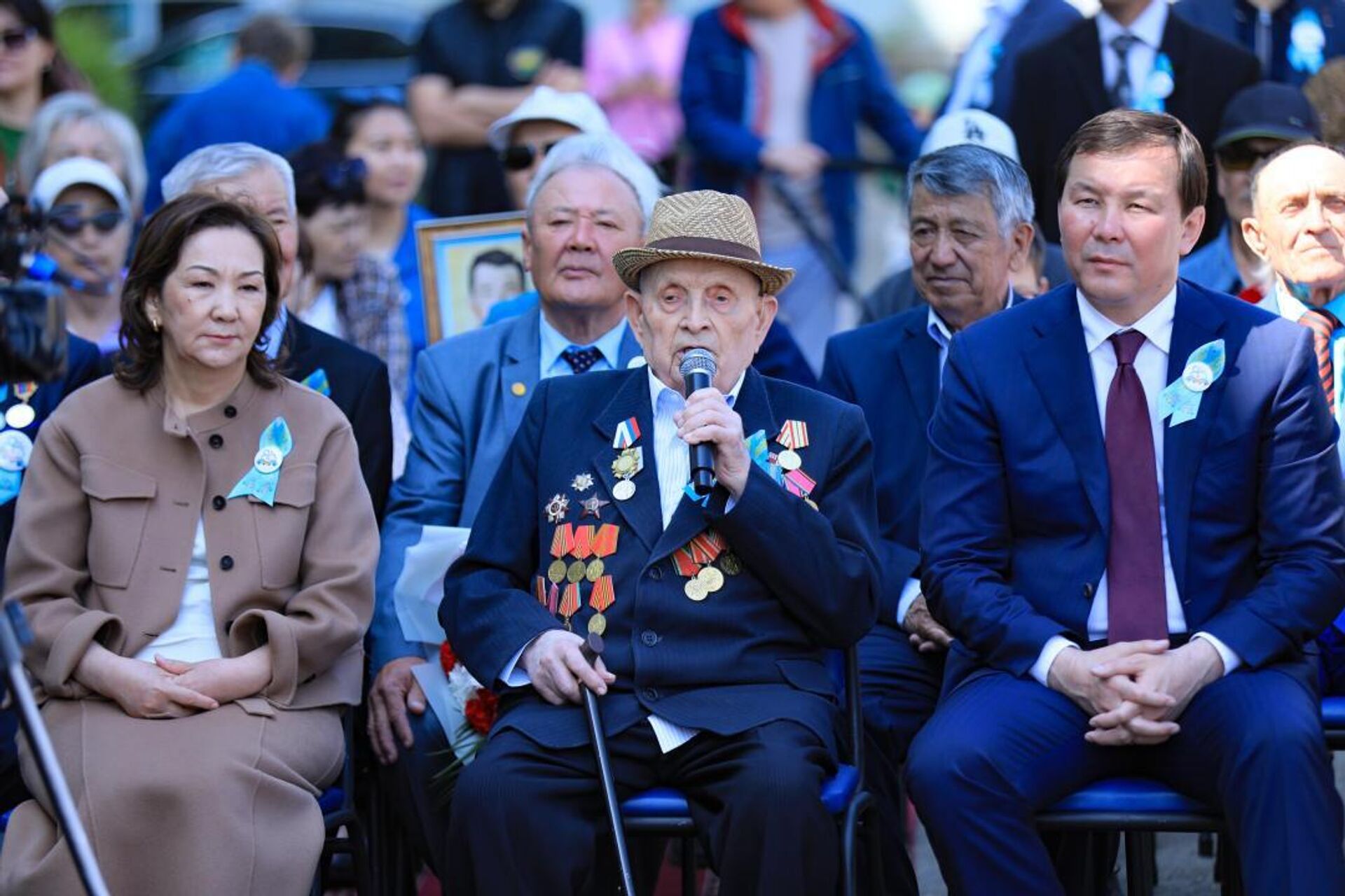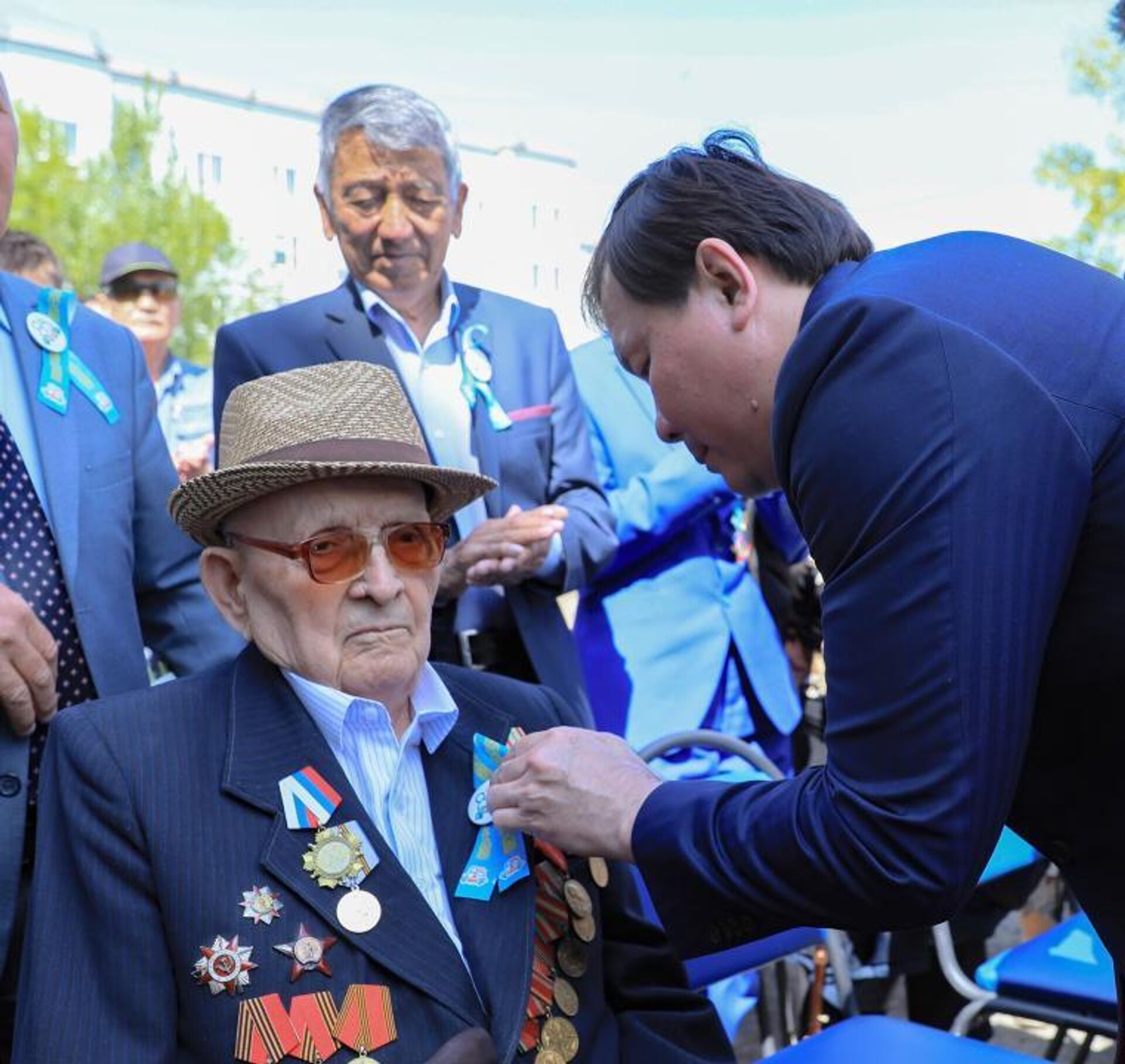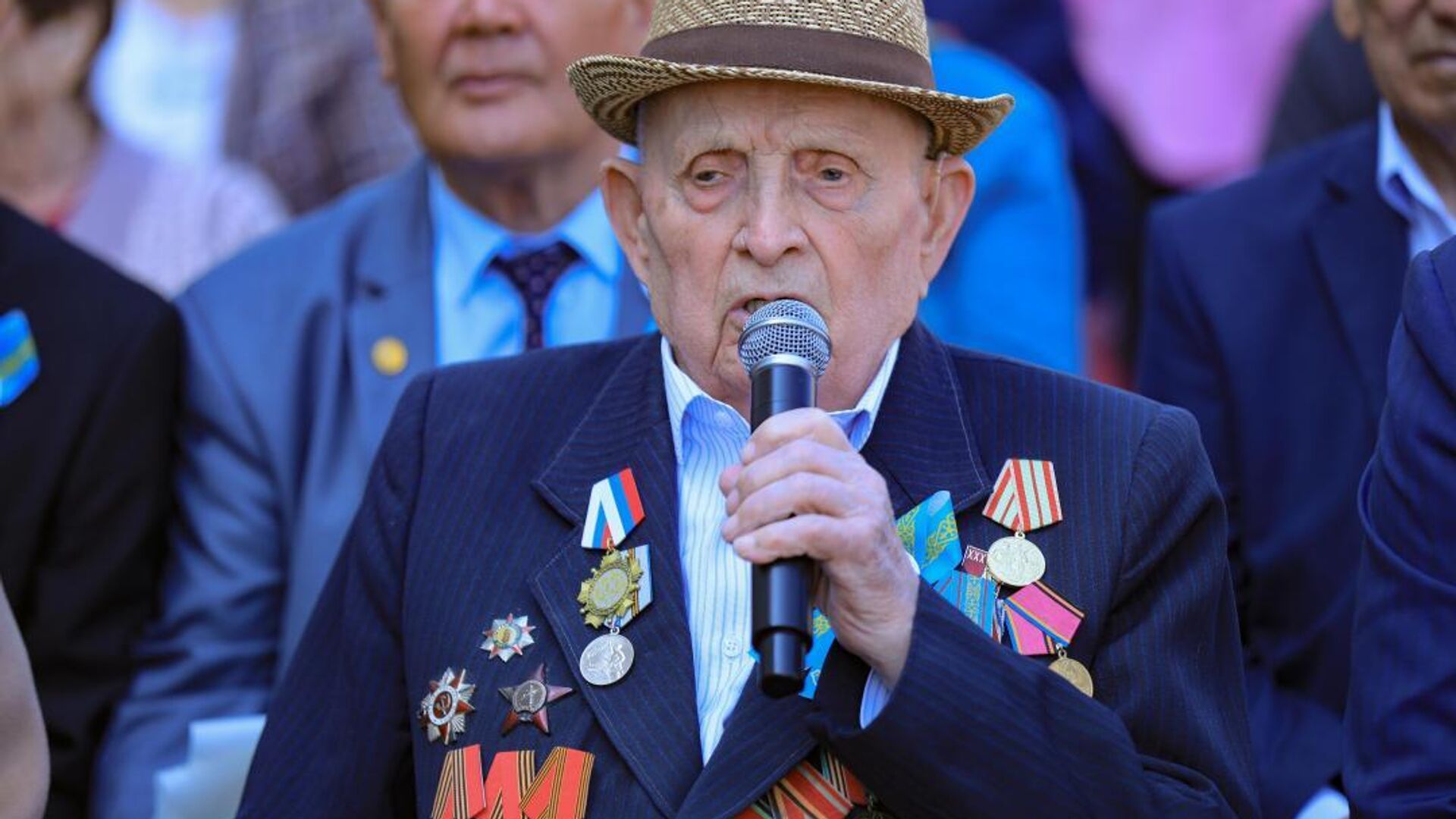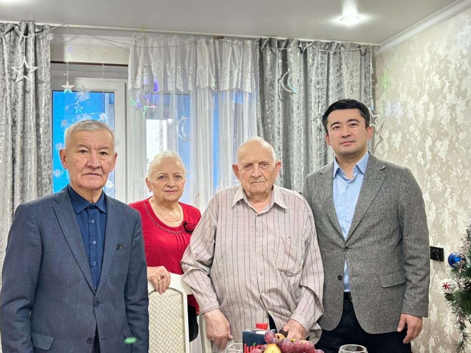 В День Победы ветерана поздравил аким Актюбинской области Асхат Шахаров. Он зачитал поздравительное письмо от имени Токаева.