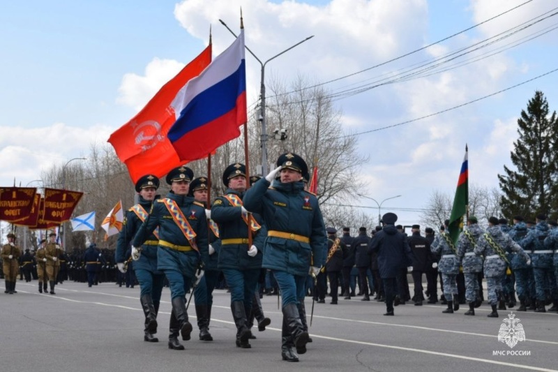 Знамённая группа ведомства пронесла по площади Знамя Победы и флаг Российской Федерации. В составе сводного оркестра в параде традиционно приняли участие музыканты духового оркестра Главного управления МЧС России по Архангельской области.