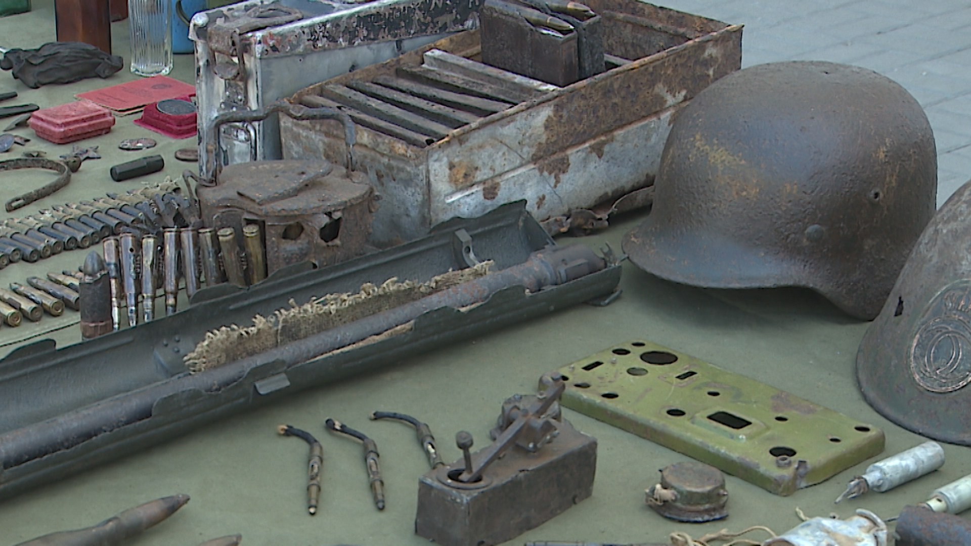 На перроне развернулись тематические площадки. Экспонаты, поднятые из окопов: каски, штык-ножи, пулеметные ленты, даже бритвенные станки. Чтобы каждый смог увидеть оружие и предметы быта защитников Сталинграда вживую, а не на картинках.