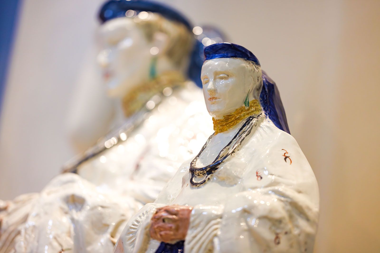 Для искусства керамики 1920–1930-е годы были временем интенсивных поисков и формирования нового облика керамической промышленности. Предпосылки к этому возникли еще на рубеже столетий, когда профессиональные художники обратились к керамике как к пластичному и цветоносному материалу для создания произведений, не похожих на привычные кузнецовские модели. Среди первых, кто пришел на производство, был известный скульптор Иван Ефимов. На Тверской фабрике Товарищества производства фарфоровых и фаянсовых изделий М.С. Кузнецова в 1914 году он создал в фаянсе выразительные фигуры дородных тамбовских баб в национальных праздничных одеждах. На выставке представлены более поздние повторения этих моделей — 1927-го и 1959-го.