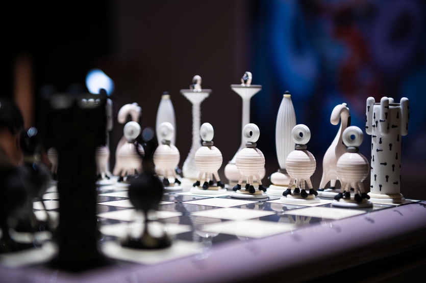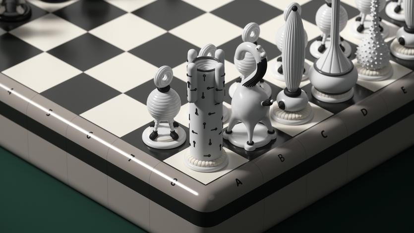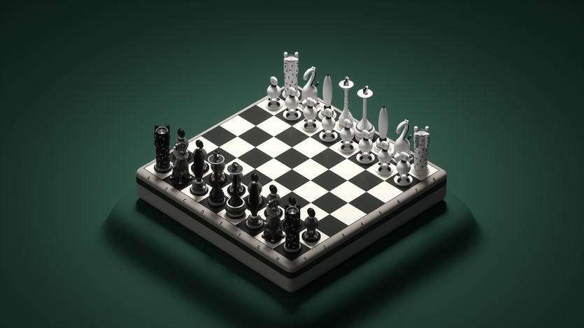 Привычная чёрно-белая гамма здесь разыгрывается в необычных формах и образах. Биоморфные, обтекаемые шахматные фигуры напоминают art toys, коллекционные игрушки.