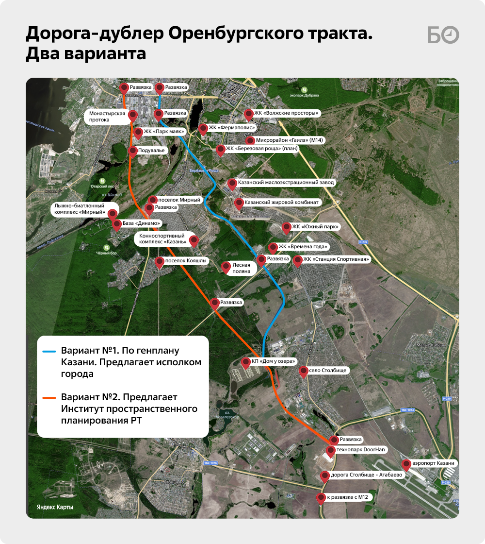 По словам Ханифова, строиться дублер будет не один год, но проектирование началось, решаются и вопросы финансирования. Однако, как выяснил «БИЗНЕС Online», вокруг трассировки платного дублера Оренбургского тракта по территории Казани возник спор. Есть два варианта: один — согласно утвержденному генплану Казани; второй — новый, предложенный Институтом пространственного планирования РТ (ИПП).