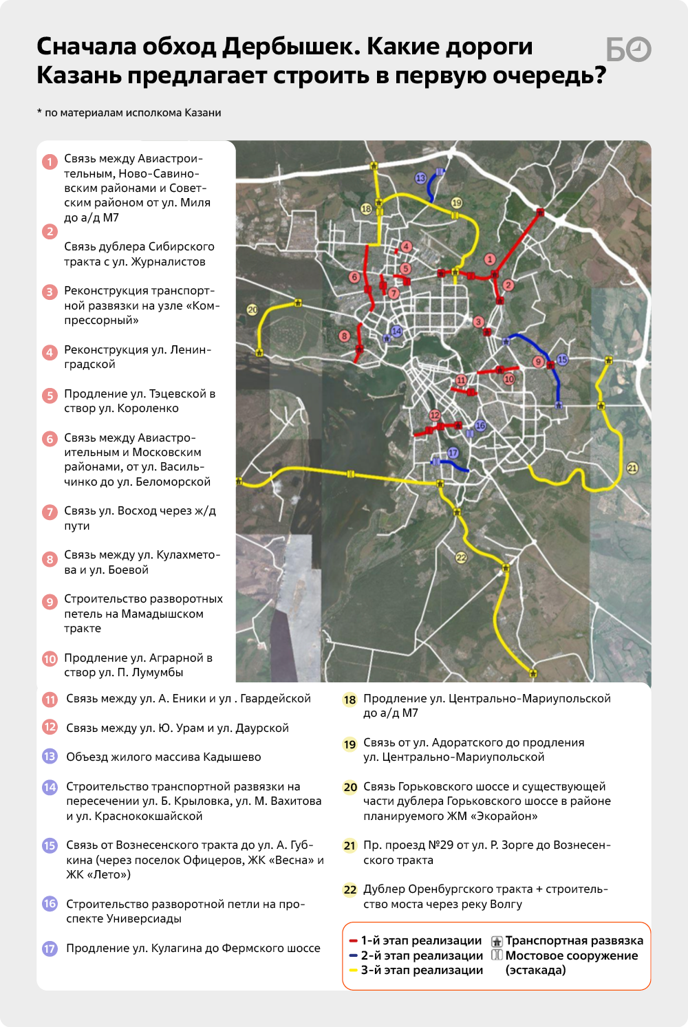 ИПП видит дорогу-дублер Оренбургского тракта уже на первом этапе развития автодорог Казанской агломерации. У города же список первоочередных внутригородских дорог возглавляет обход Дербышек, а дублер Оренбургского тракта на 22-м месте, в последнем, третьем этапе.