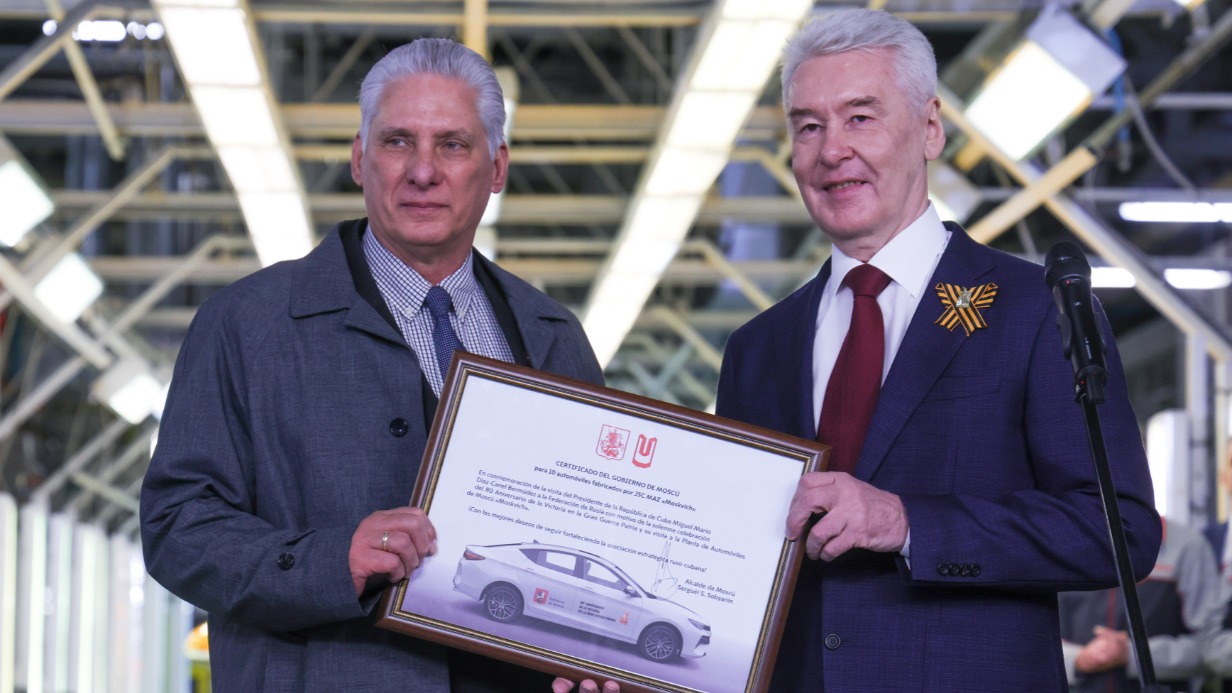 Мэр Москвы Сергей Собянин и президент Республики Куба Мигель Диас-Канель посетили автомобильный завод «Москвич». Глава города вручил президенту Республики Куба сертификат на 10 автомобилей «Москвич 6» для социальных служб Гаваны / Фото: Владимир Гердо / ТАСС
