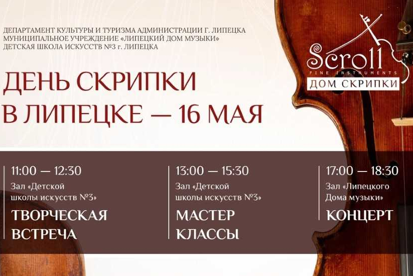 Липецкий Дом музыки 16 мая представит «День скрипки». Главный гость — профессор музыкальной академии «Accademia Del Ridotto» Георгий Левинов, Италия. В этот день в Детской школе и искусств №3 Липецка в 11:00 состоится творческая встреча с маэстро, с 13:00 до 15:30 он проведет мастер-классы.