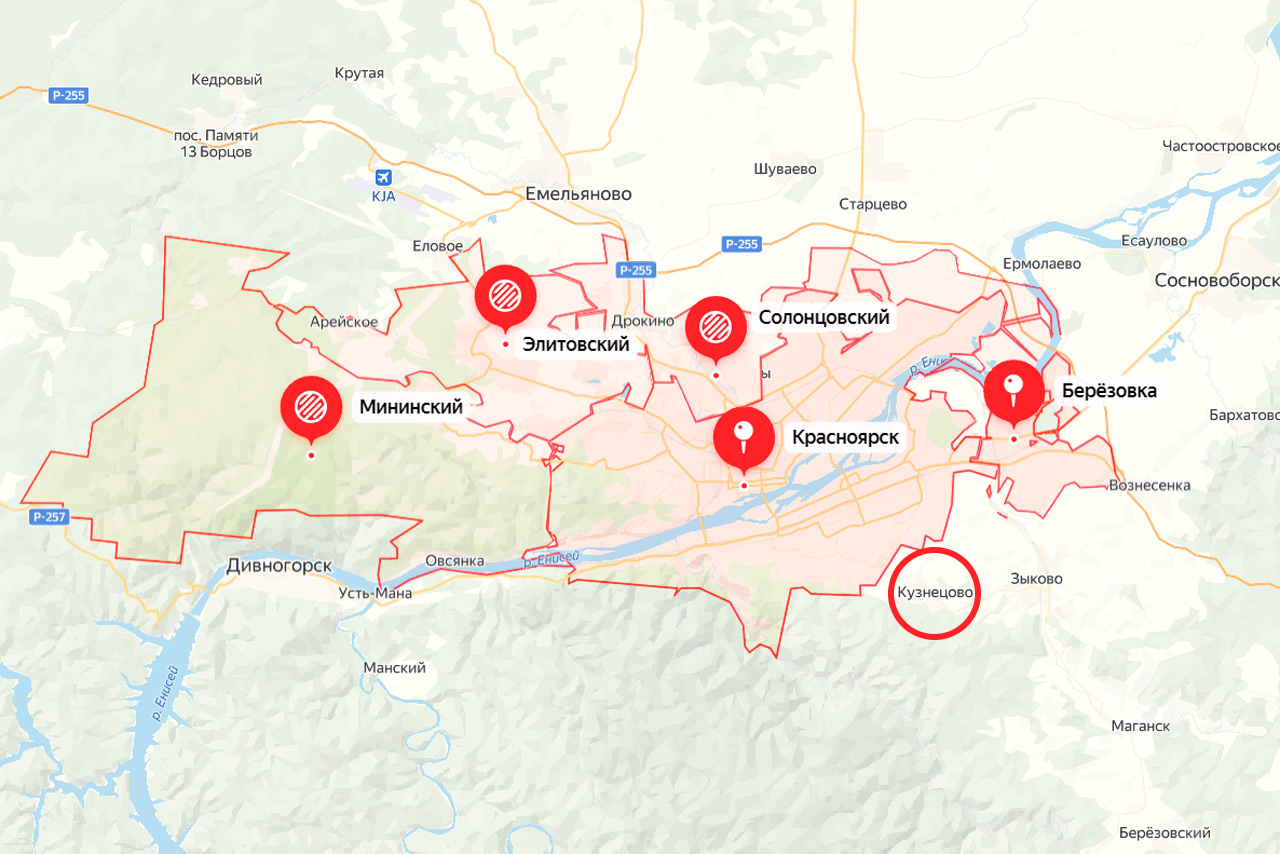 Так будет выглядеть территория нового городского округа город Красноярск. Кузнецово в составе Зыковского сельсовета осталось в стороне – по краней мере, пока