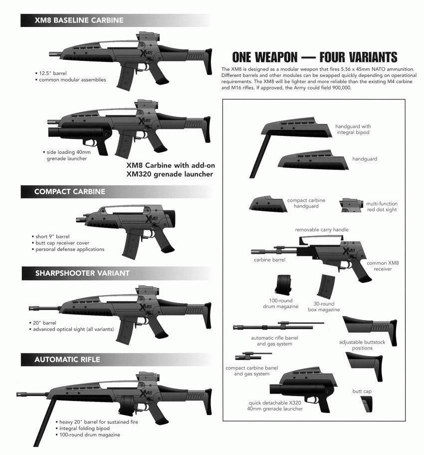 Немцы решили, что конструкция перспективная: они поделили комплекс на две части и отправили на доработку. За основу нового автомата они взяли свой G36 и низ XM29 и получили новый XM8: точный, лёгкий и скорострельный. На испытаниях автомат показал неоднозначные результаты.
