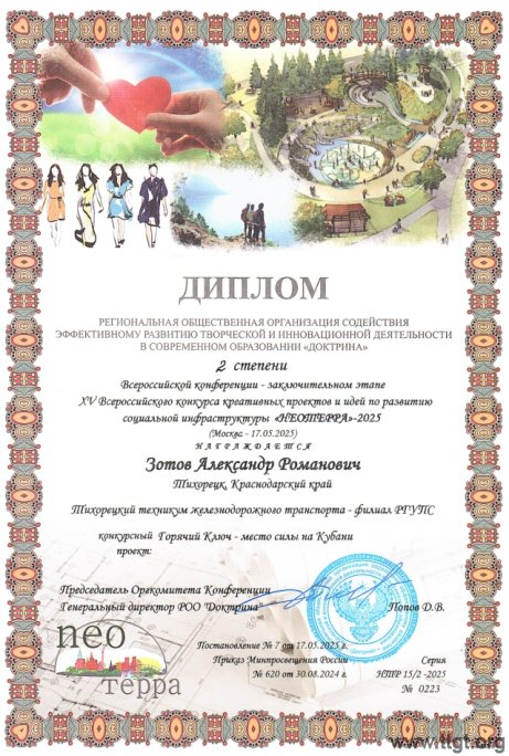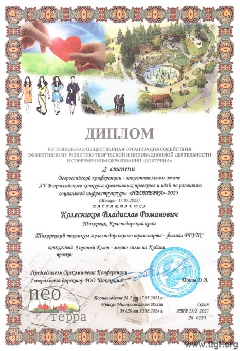 17 мая 2025 года в г. Москва в конгресс центре гостиницы Измайлово состоялся XV Всероссийский конкурс креативных проектов и идей по развитию социальной инфраструктуры «НЕОТЕРРА», в котором приняли участие студенты группы ПМ-2-1 специальности 23.02.04 Техническая эксплуатация подъемно-транспортных, строительных, дорожных машин и оборудования (по отраслям) Зотов Александр и Колесников Владислав под научным руководством преподавателя техникума Сафроновой О.В. Конкурс включен в Приказ Министерства просвещения Российской Федерации от 30.08.2024 № 620 «Об утверждении перечня олимпиад и иных интеллектуальных и (или) творческих конкурсов, мероприятий, направленных на развитие интеллектуальных и творческих способностей, способностей к занятиям физической культурой и спортом, интереса к научной (научно-исследовательской), инженерно-технической, изобретательской, творческой, физкультурно-спортивной деятельности, а также на пропаганду научных знаний, творческих и спортивных достижений, на 2024/25 учебный год».