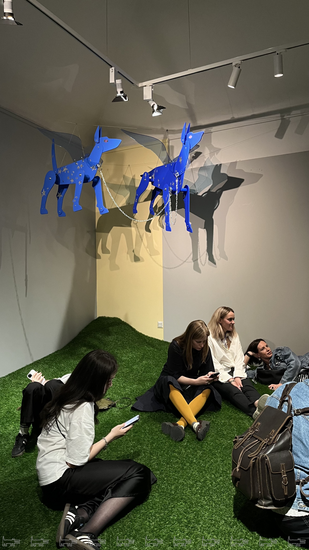 - Инсталляция «Созвездие гончих псов» Софии Азархи.Левитирующие собаки + зеленый холм, на котором зрители могут поваляться.