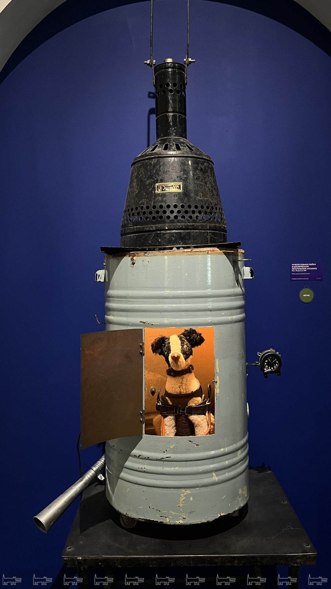 - Инсталляция «Действующее чучело собаки Павлова» Ольги Флоренской.Объект снабжен лампочкой (естественно!) и электрическим звонком. На каждую команду «пуск» деревянное «чучело» реагирует выделением жидкости, заранее залитой внутрь музейными сотрудниками.