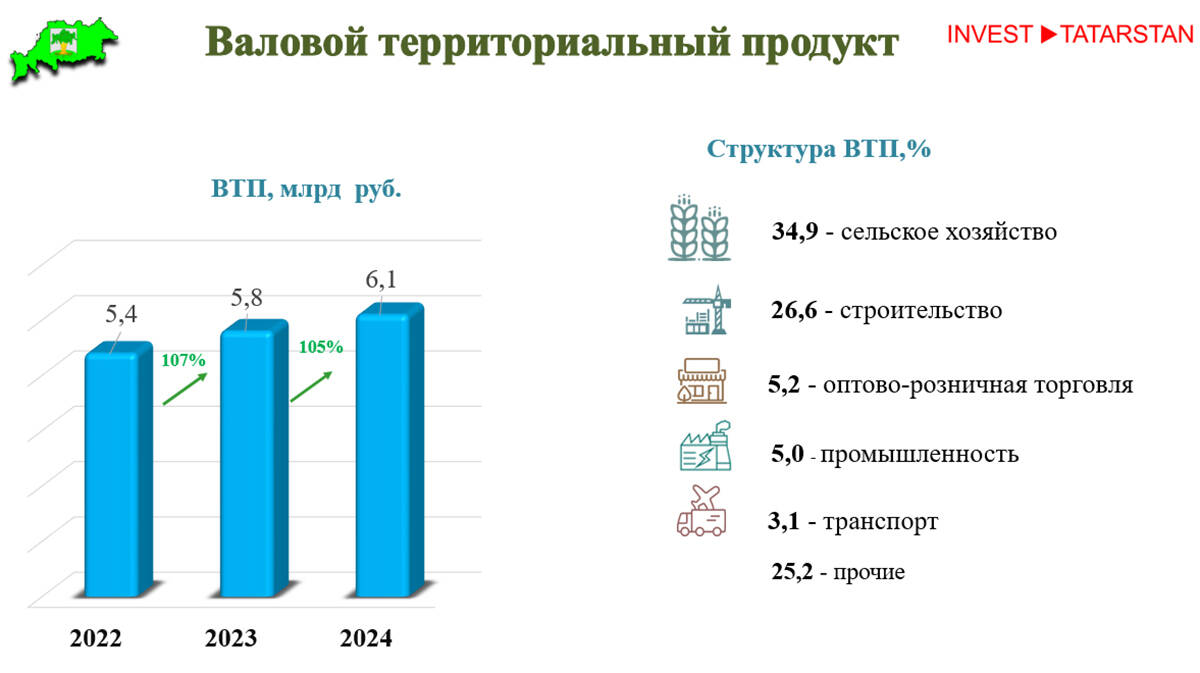В прошлом году объем валового территориального продукта (ВТП) составил 6,1 млрд рублей (рост на 5%). Сельское хозяйство – локомотив Кайбицкого района (35% в структуре ВТП), на втором месте – строительство (почти 27%).