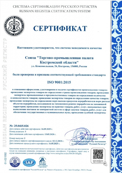 Торгово-промышленная палата Костромской области подтвердила высокий уровень качества своей деятельности в отношении оформления, удостоверения и выдачи сертификатов происхождения товаров, а также различного вида экспертиз, что делает сотрудничество с нами более продуктивным и взаимовыгодным!