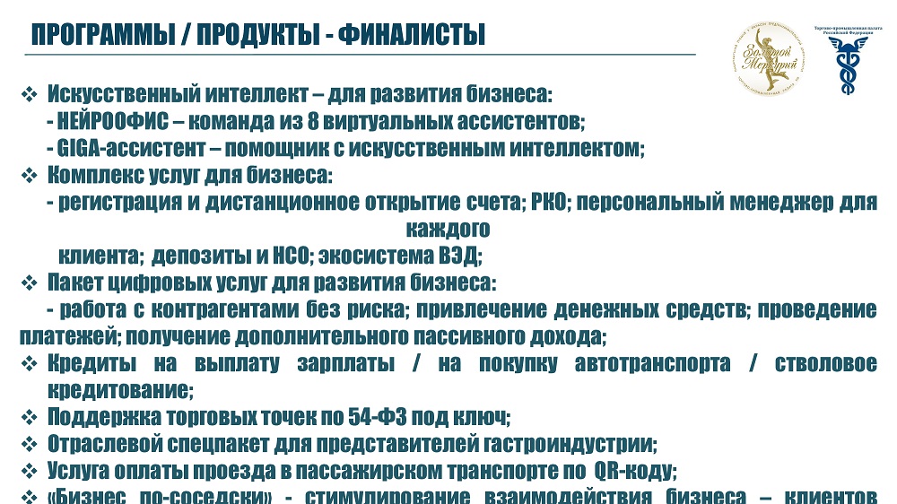 Представленный в этом году спектр программ банков – участников финала довольно широк: от использования возможностей искусственного интеллекта в интересах бизнеса до системы оплаты услуг в пассажирском транспорте, от кредитования до эквайринга на выгодных условиях, от комплекса обычных и цифровых услуг до специальной программы для представителей гастроиндустрии. Есть даже лизинг оборудования для промышленного майнинга!