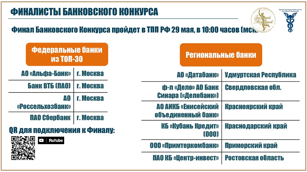Финал Конкурса пройдет 29 мая в Конгресс-центре ТПП России, начало в 10:00 часов мск. Банки - участники финала проведут краткую презентацию (до 5 минут) в очном или дистанционном формате своих ключевых программ / продуктов для бизнеса.