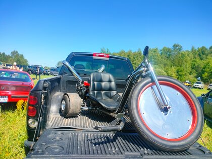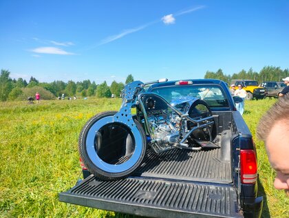 Также можно было посмотреть на “нетипичные” для грязи авто: посреди луга в притоптанной траве таился классический спорткар. Рядом, в кузовах пикапов, - мотоцикл и трицикл, выполненные в эстетике ретро-футуризма. Как сказал хозяин техники, это вольное творчество, а не транспорт: оба “средства передвижения” - модели в “натуральную величину”.