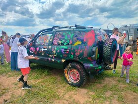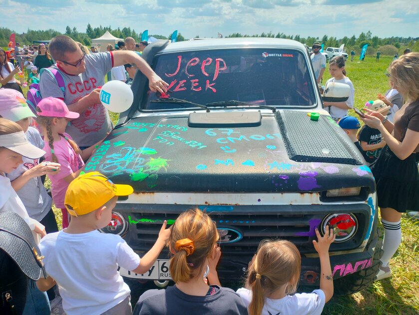 Юные смоляне также могли позажигать с аниматорами и пораскрашивать картинки. Больше всего запомнилось раскрашивание двух внедорожников “Нива”, предоставленных одним из спонсоров фестиваля, внедорожным сообществом Battle Drive. Гипоаллергенные краски привели в восторг не только малышей: подростки и взрослые посетители воспользовались шансом оставить автограф на белой классической “Ниве” и темно-зеленой “Шевроле”.