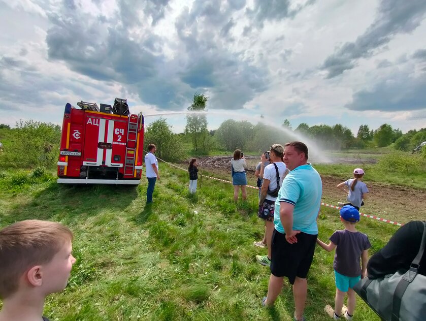 Завершением стала масштабная гонка. Чистенькие автомобили с “постаментов” и замазанные грязью участники OffRoad Taxi выстроились на старте, пока пожарные поливали трассу из брандспойта и лафетного ствола на крыше спецавомобиля. Чтобы грязь была более грязной, а жижа - более жидкой.