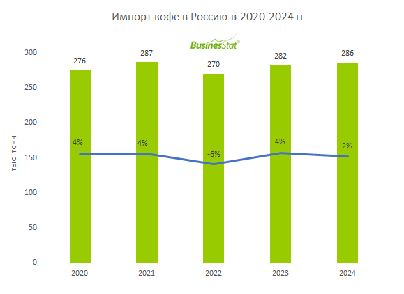 По данным «Анализа рынка кофе в России», подготовленного BusinesStat в 2025 г, его импорт в страну в 2020-2024 гг возрос на 4%: с 276 до 286 тыс т, благодаря увеличению внутреннего спроса. При этом увеличивался в основном импорт зеленого кофе, который служит сырьем для производства кофе для конечного потребителя внутри страны при относительной стабильности импорта кофе, готового к продаже.