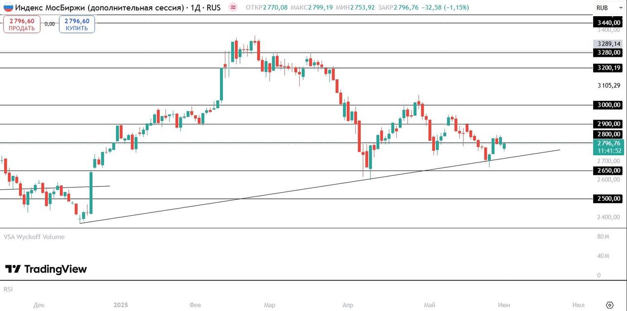 Техническая картина Индекс Мосбиржи. Индекс пытается уйти выше 2800 пунктов. При закрытии выше этого уровня возможен рост до 2900-3000 пунктов.