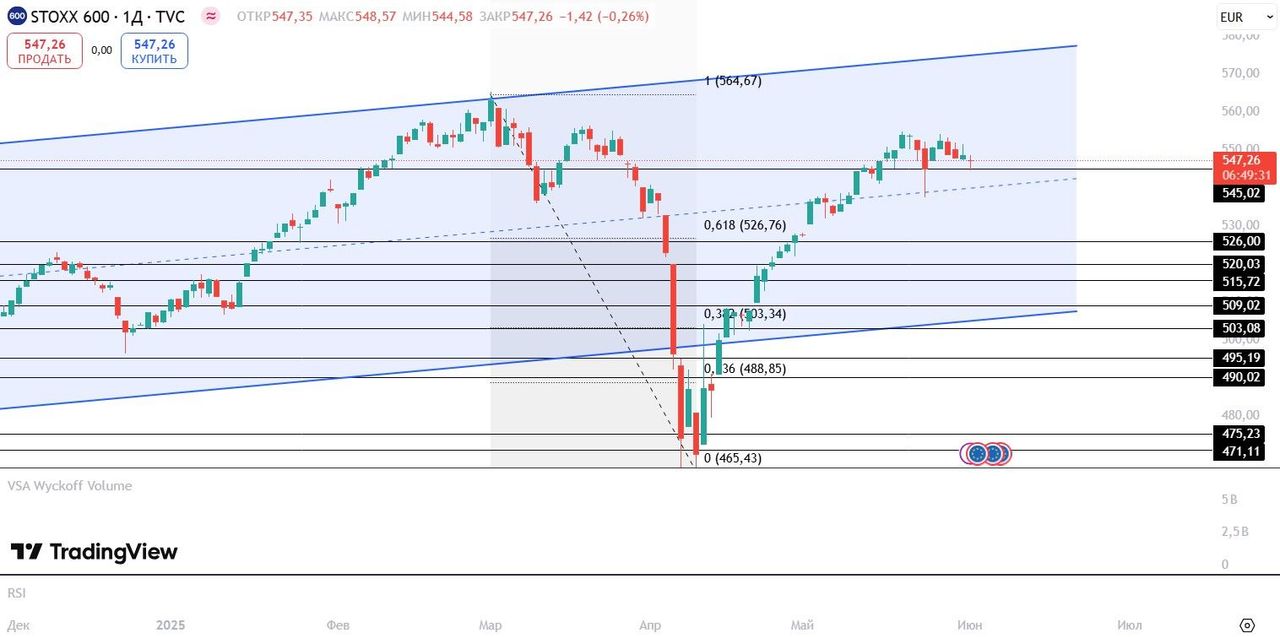 Euro STOXX 600. STOXX 600 также удержал поддержку 545 пункта. Возможен рост до верхней границы глобального канала 575 пунктов.