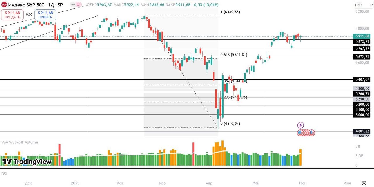 S&P 500. На дневном графике S&P 500 удержал поддержку 5873 пункта. Возможен рост до исторического максимума 6147 пунктов.