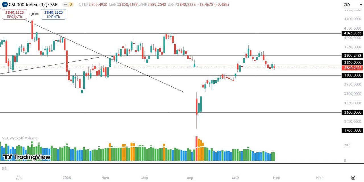 CSI 300. Индекс вновь ниже 3860 пунктов. Возможно снижение до 3800 пунктов.
