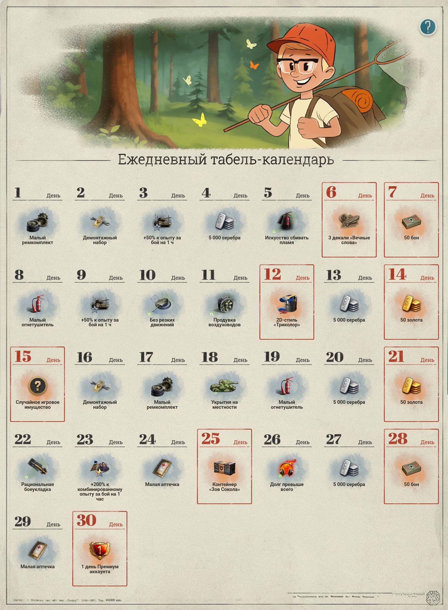 В ноябре разработчики «Мира танков» вернули ежедневный табель-календарь. В нем на протяжении всего месяца игроки могут получать награды. Чтобы их забрать, нужно зайти в календарь, отметиться и запустить клиент игры. Он будет обновляться каждый месяц.