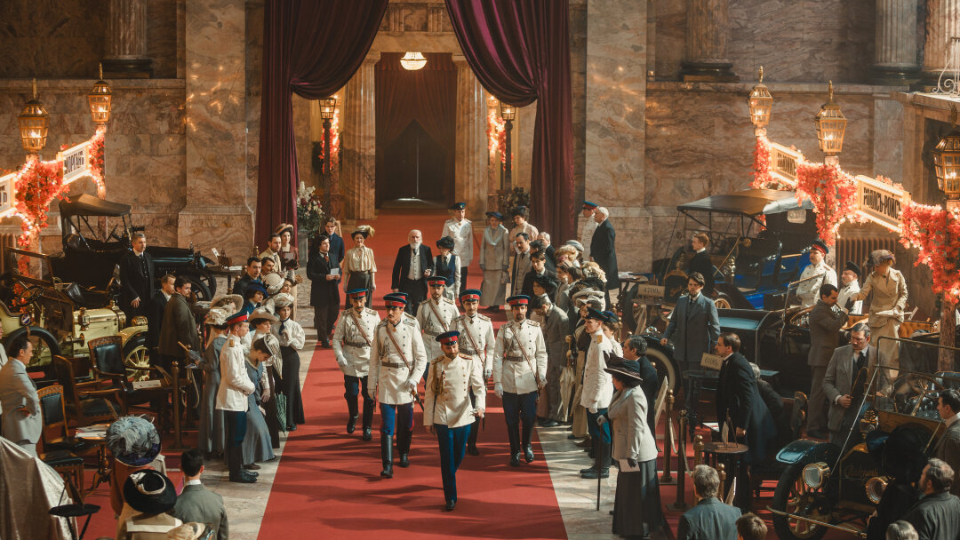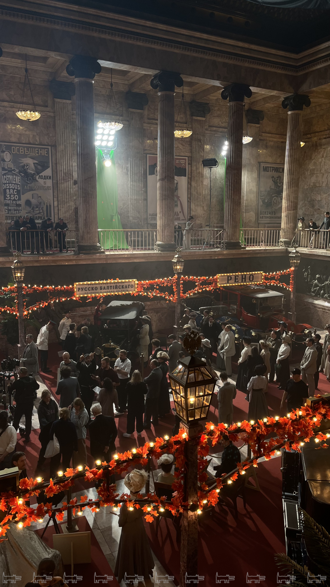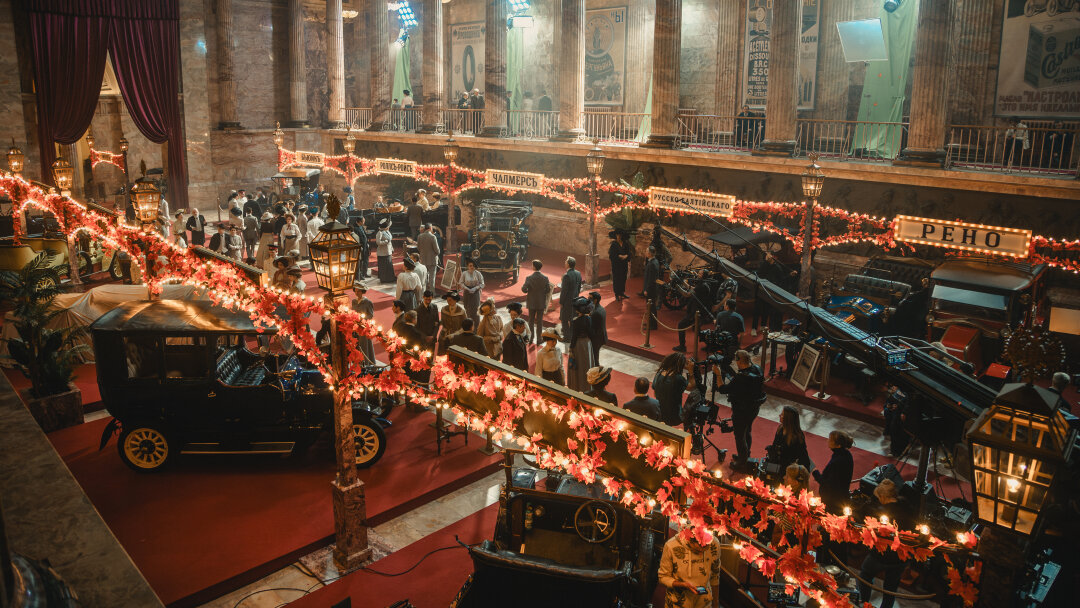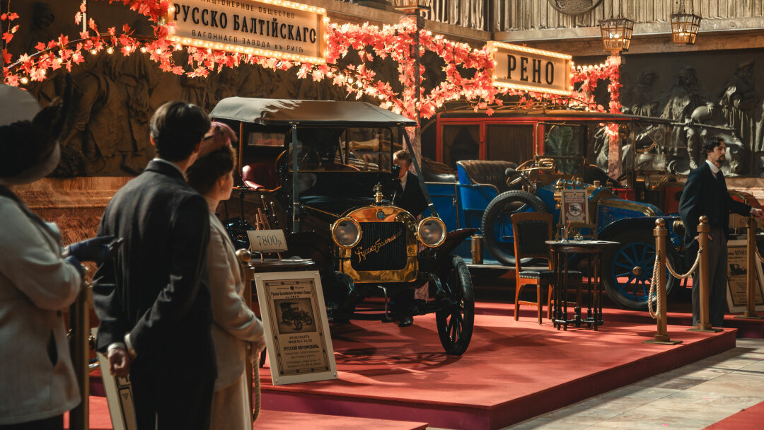 Съемка роуд-муви в Черногории и Сербии — еще впереди, а в Этнографическом воссоздали выставку, на которой команда «Руссо-Балта» впервые презентовала свою модель. По обе стороны гигантского зала с колоннами шеренгами выстроились десять стендов с ретроавтомобилями: среди них — «Роллсъ-ройсъ», «Фордъ», «Рено», «Чалмерсъ», «Дiaмлеръ». И главный экспонат — «Акцiонерное общество Русско Балтiйскаго вагоннаго завода въ Ригъ».