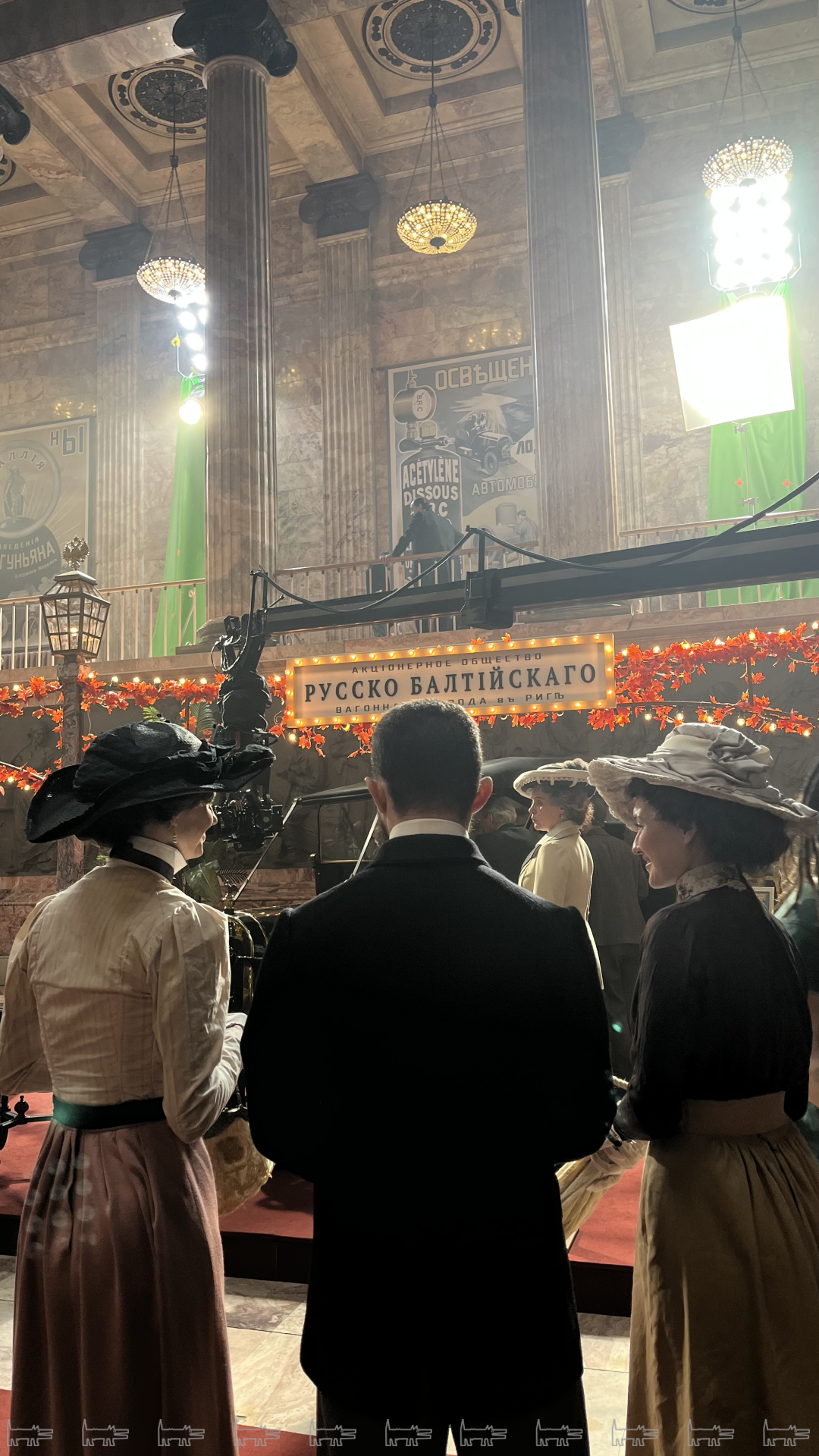 Массовка в костюмах аристократов начала ХХ века прогуливается тут же по залам Этнографического. Слышен шепот: «А вы в “Короле и шуте” не снимались?», «Нет, а вы?». Тем временем ассистенты тщательно пылесосят красную дорожку — в кадре вот-вот должен появиться Николай II в окружении свиты. Один из сопровождающих киношного императора — актер Максим Ханжов — молниеносно входит в образ представителя высшего общества: ему срочно необходимо заменить перчатки — нынешняя пара села неидеально.