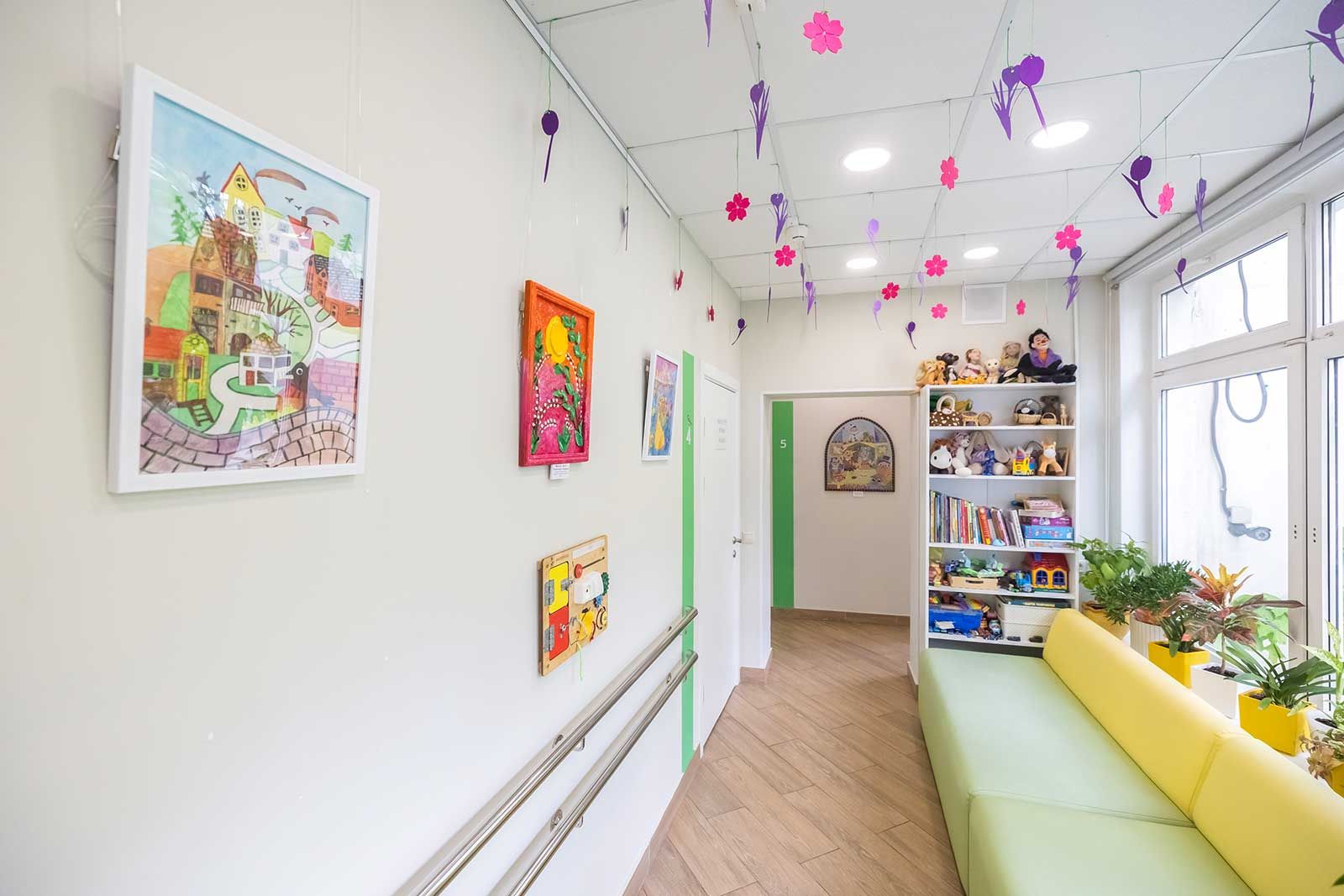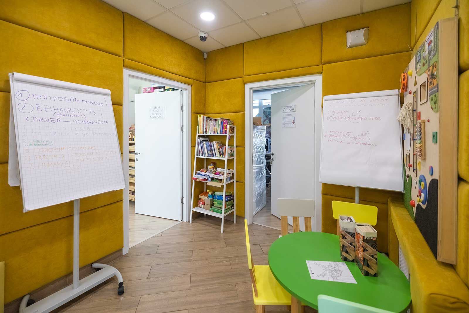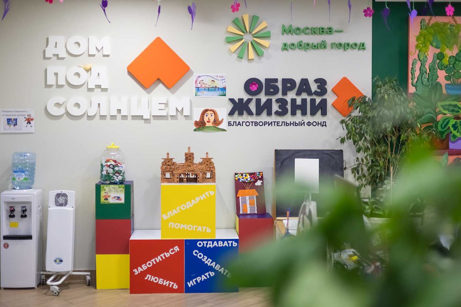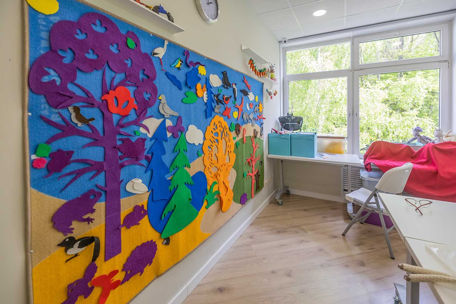 Внутри «Дома под солнцем» видим нарисованные домики на ярко-зеленом лесном фоне, под потолком развешаны плетеные шары, похожие на гнезда. Всюду цветы в горшках, стенды с рисунками подопечных, полки с игрушками. А в одной из комнат стену занимает войлочная поляна-ковер «Волшебный лес»: к ней можно прикреплять разноцветные дубы, лягушек, ласточек, белок на липучках, создавая свою вселенную. При этом посетители центра стараются запомнить названия животных и растений.