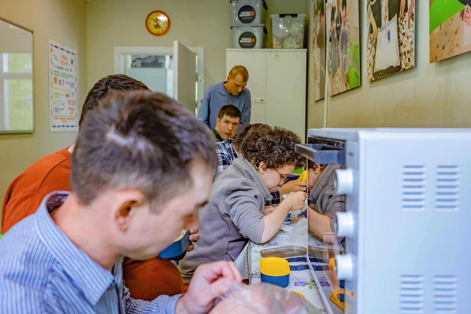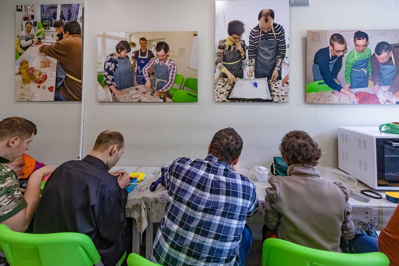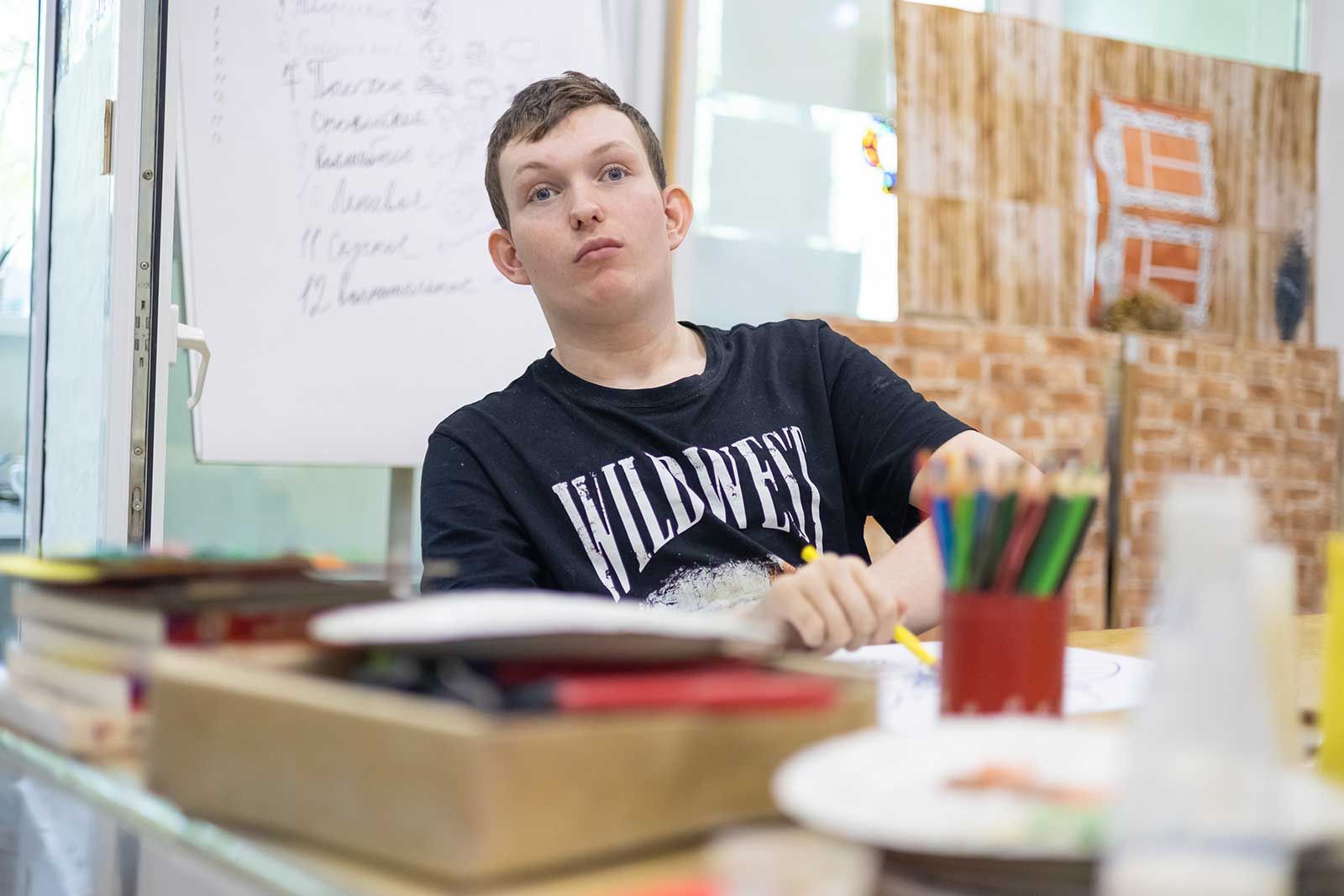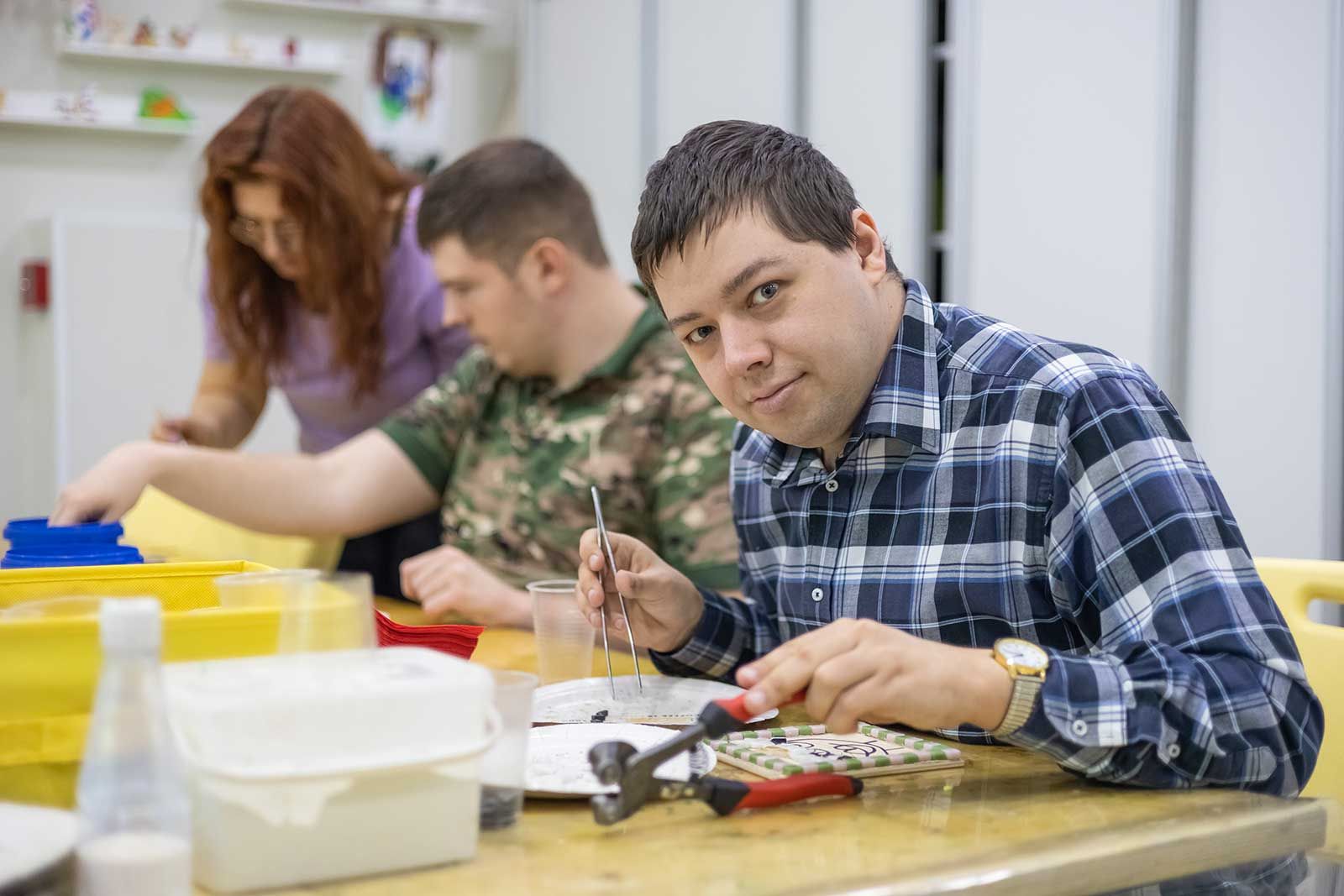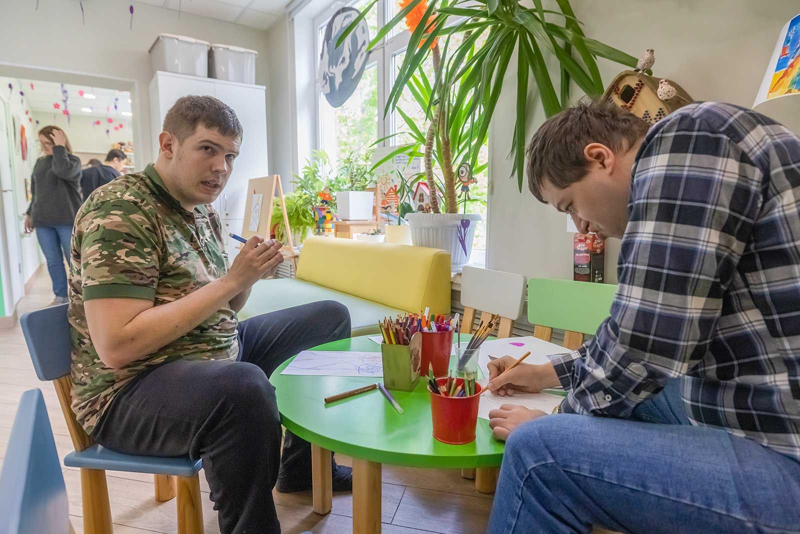 В другом классе молодые люди лепят из пластилина картинки, у одного получается кораблик, у другого — павлин. Тему рисунка каждый выбирает сам. Один юноша незрячий и почти не владеет памятью и речью, узнает людей, приложив их руки к своему лицу. Однако он сумел слепить из пластилина розовую отвертку и капибару.