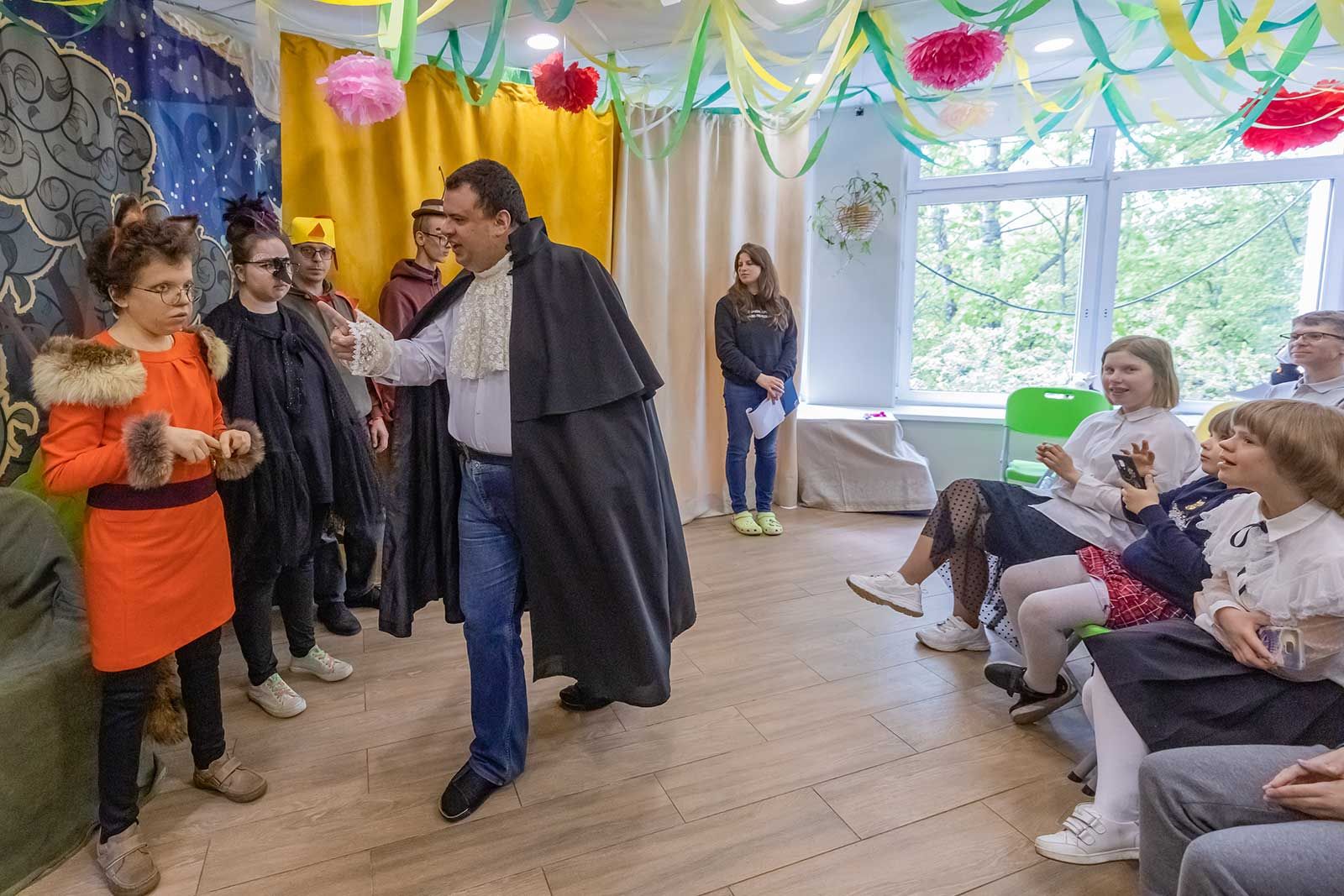На спектакль приехали дети из особых семейных центров «Роза ветров» и «Семь-Я». Они смеются и хлопают в ладоши, глядя, как герои басен Ивана Крылова сменяют друг друга на сцене. После представления, которое длится всего 20 минут, чтобы не утомлять актеров и зрителей, гостей зовут на дискотеку, и маленькие вместе со взрослыми, довольные и счастливые, танцуют.