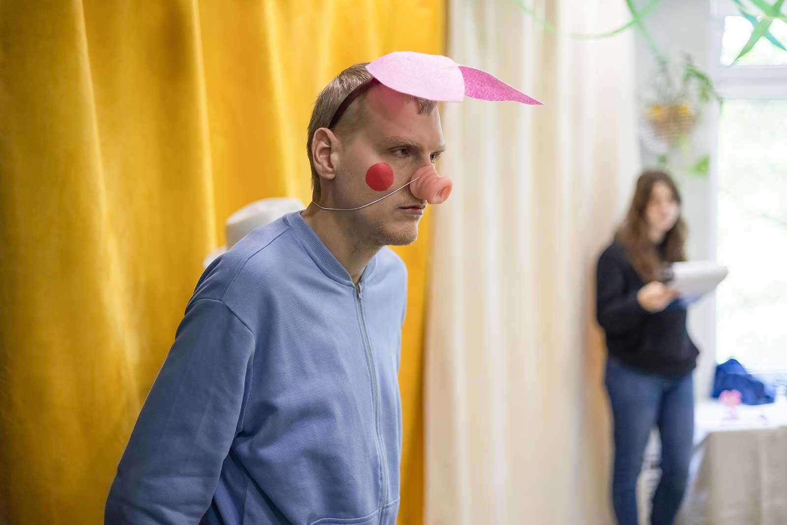 Так, 18-летний Сергей Рогов увлекается зоологией и прекрасно фотографирует природу, но с трудом разговаривает и сторонится людей. В спектакле он — молчаливый и серьезный Муравей: собирает пластиковые фрукты в корзинку, тянет по полу пуфик-мешок, где по сценарию хранятся запасы провизии на зиму. А его ровесница Алиса Попова отлично владеет письменным русским языком и сочиняет сказки, но испытывает сложности в общении — ей близки роли Вороны, Стрекозы и Кукушки. Чтобы сыграть таких персонажей, девушке не нужно произносить много слов. Так, в диалоге с Петухом она говорит лишь: «Тебя, мой куманек, век слушать я готова». А Илья Шрагин не владеет речью, но и ему нашлась роль: он изображает дерево в отрывке басни «Свинья под дубом».