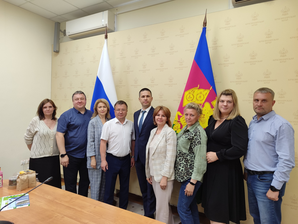 В понедельник, 2 июня, состоялась рабочая встреча делегации Алтайского края с начальником отдела развития департамента потребительской сферы и регулирования рынка алкоголя Краснодарского края Константином Кошелевым, коммерческим директором краснодарского агроагрегатора «Южный» Ольгой Гусаченко и руководителем проекта агроагрегатора торговой сети X5 Group Сергеем Клюйко, сообщает официальный сайт региона. Во встрече приняли участие начальник управления Алтайского края по пищевой, перерабатывающей, фармацевтической промышленности и биотехнологиям Александр Большаков, начальник отдела развития малых форм хозяйствования и кооперации Минсельхоза Алтайского края Алла Мердяшева, представители компаний «Рикон», «АлтайПлод», «Специалист», «АлтайЭкоПроект», «Амара» и торгового дома «Дягиль» (индивидуальный предприниматель Елена Переверзева).