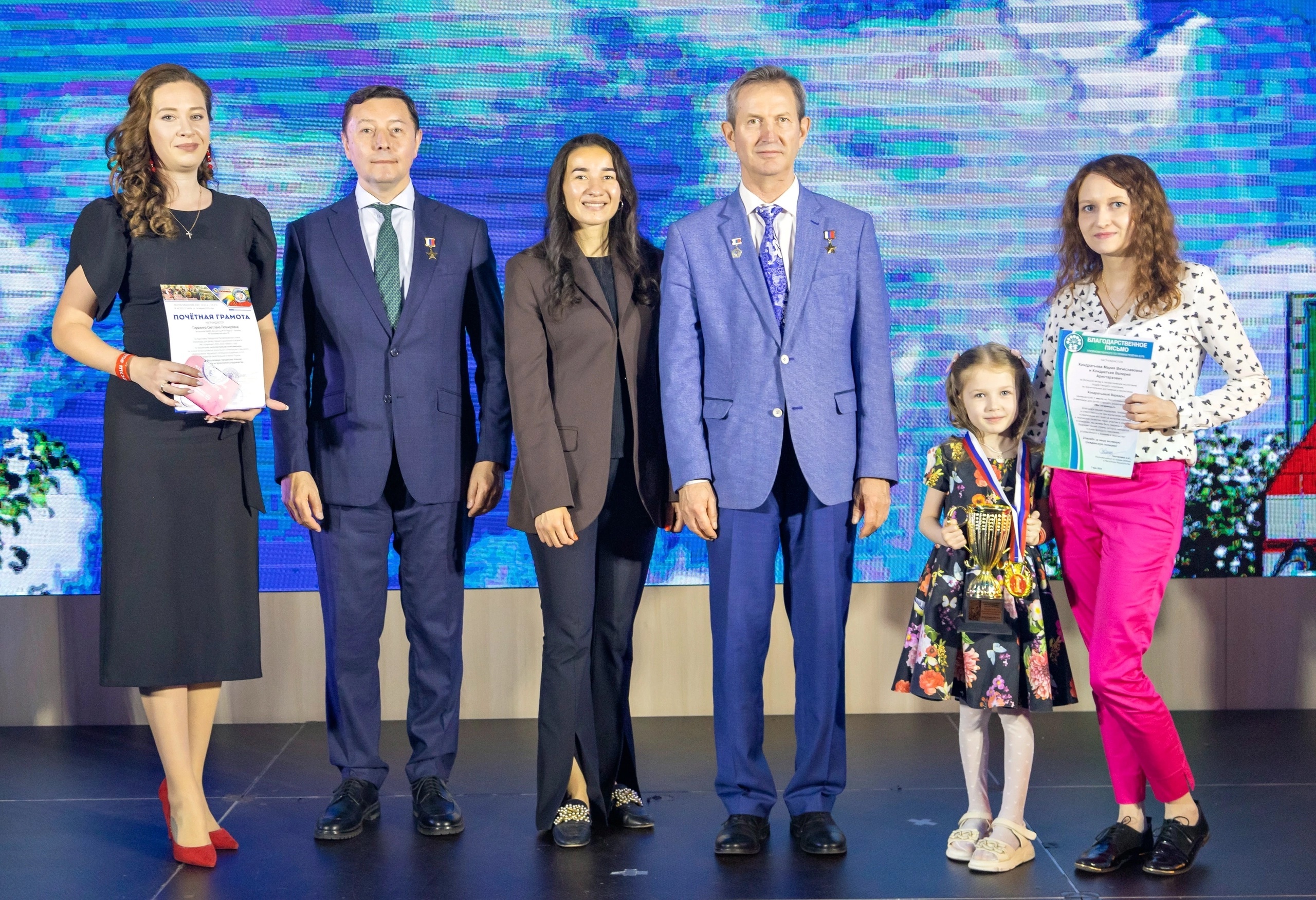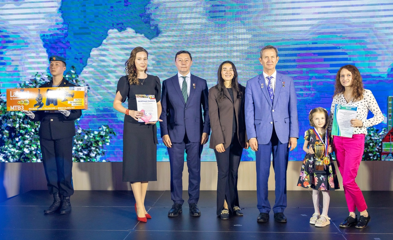 На церемонию была приглашена победительница Республиканского этапа Кондратьева Варвара- воспитанница подготовительной группы №5 "Теремок"детского сада №39 «Радуга» , которая заняла 1 место. В рамках торжественной церемонии награждения все призёры республиканского этапа олимпиады «Мы – Гагаринцы!» получили заслуженные награды: памятные дипломы, специально изготовленные медали с символикой конкурса, а также ценные подарки, которые станут отличным подспорьем для дальнейшего развития юных дарований. Особое внимание организаторы уделили тому, чтобы каждая награда отражала значимость интеллектуальных достижений дошкольников и мотивировала их к новым свершениям. Вручение проводилось в торжественной обстановке при полном зале зрителей, создавших по-настоящему праздничную атмосферу для юных звёзд.