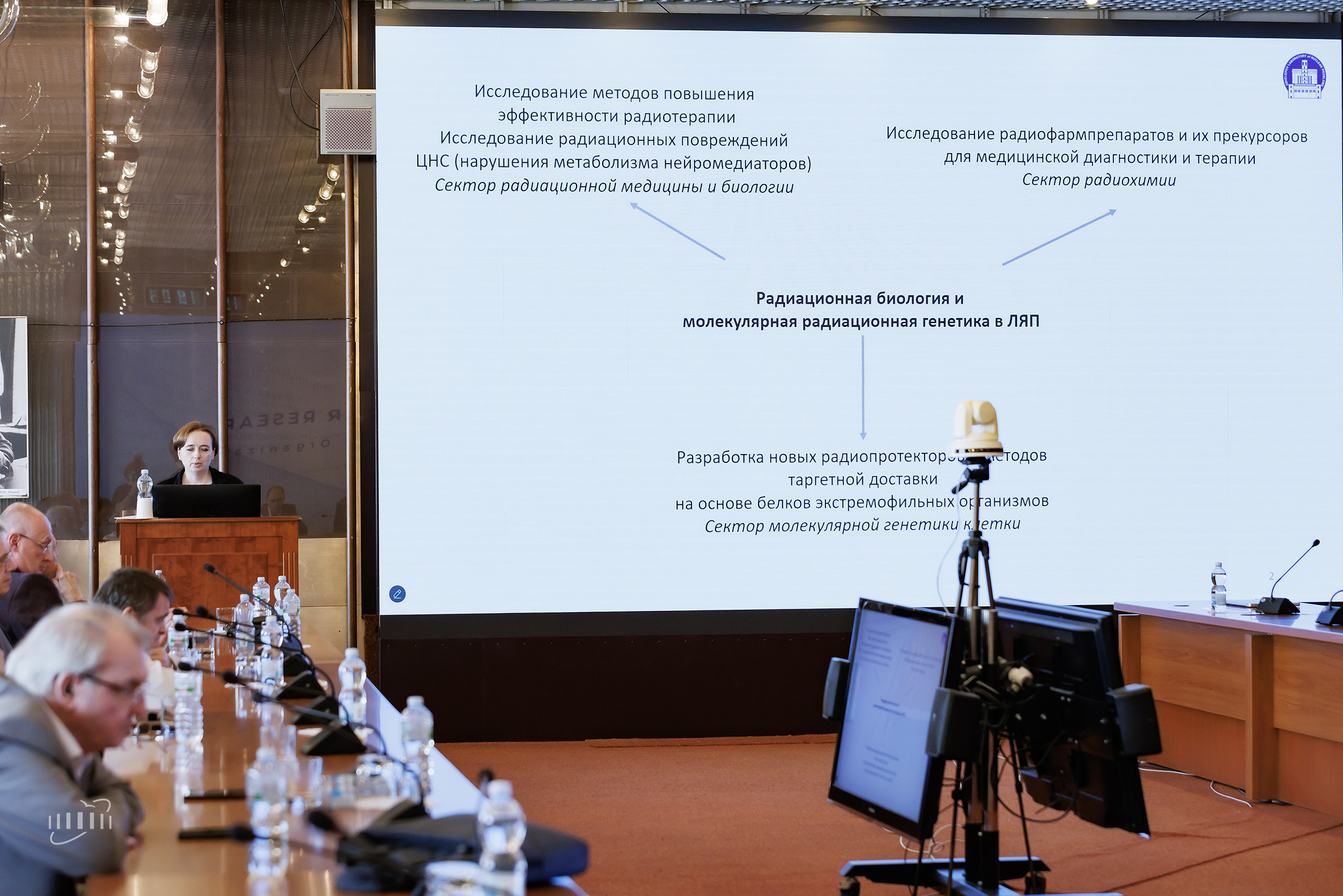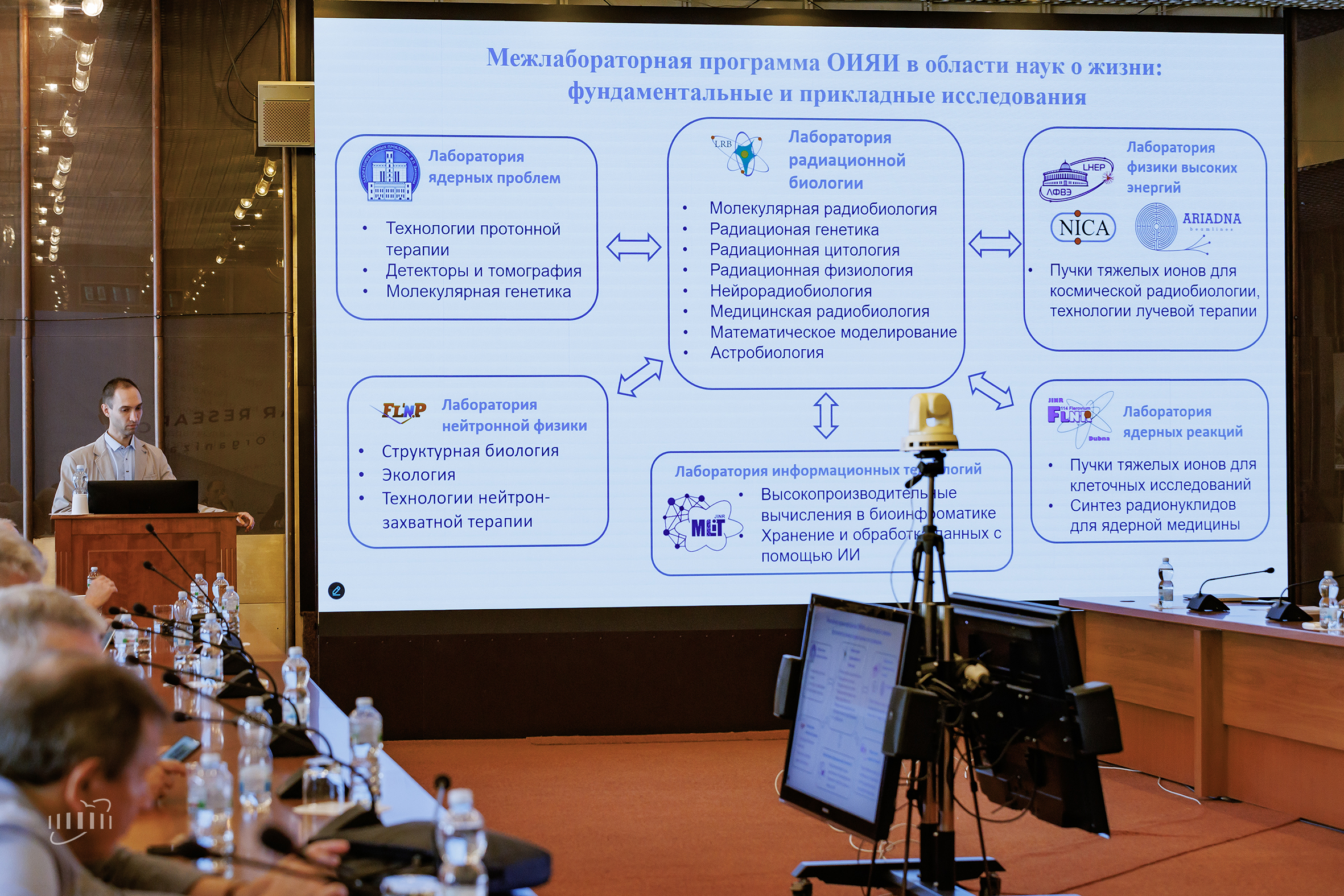 Александр Бугай обозначил мультинаправленность исследований, проводимых самой молодой из лабораторий Объединенного института. Области научного поиска сотрудников охватывают молекулярную биологию, радиационную генетику, радиационную цитологию, медицинскую радиобиологию, нейрорадиобиологию, математическое моделирование, радиационные исследования и астробиологию. Директор ЛРБ подробно рассказал о всех направлениях проводимых исследований, базовых разработках, защищенных патентами, и совместных с ведущими профильными российскими центрами НИР, например, по тематике индукции и репарации двунитевых разрывов ДНК. Ведутся социально важные исследования и тестирования радиопротекторных средств. ЛРБ внесла вклад в разработку концепции риска при пилотируемых полетах в дальний космос. Среди основных научных результатов лаборатории последних лет – разработка новых принципов радиотерапии как с помощью радиопротекторов, так и дистанционных методов, астробиологические исследования и исследования в области космической радиобиологии.