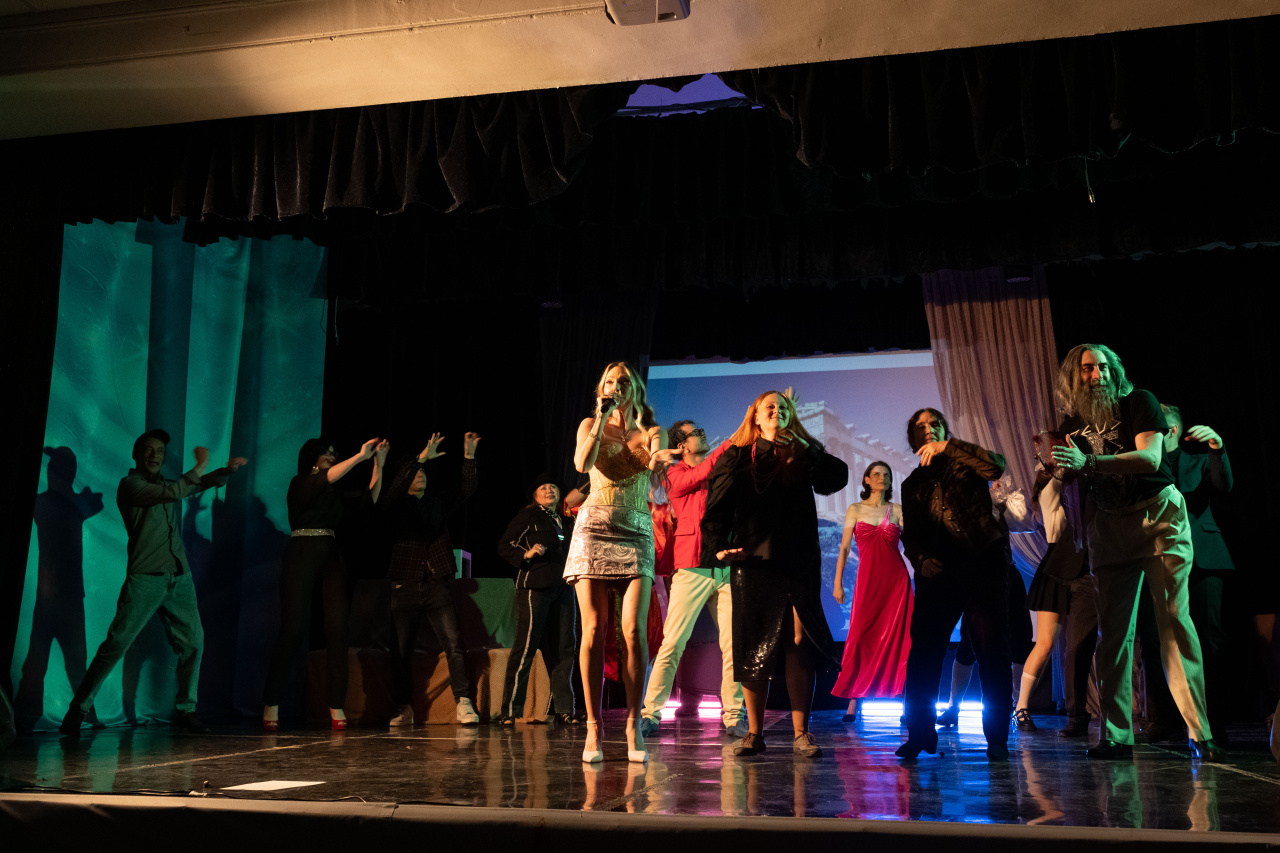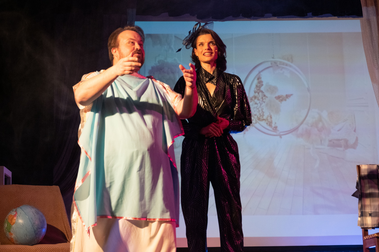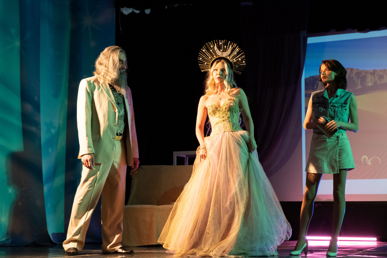 Действо получилось ярким и динамичным. За счет эффектных костюмов, реквизита, игры света и дыма удалось создать ощущение быстрого перемещения между снами и реальностью. Зритель вместе с актерами путешествует в разные эпохи, перед нами предстают поиски любви и счастья главной героини Беллы Донны, звезды шоу-бизнеса. Она успешна, богата, но почему-то ощущает некую неудовлетворенность и томление духа.