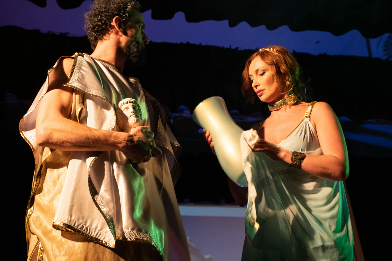 Главная героиня – олицетворение женского начала, она встречается с людьми, каждый из которых олицетворяет свою эпоху. Идея женственности и человечности проходит своего рода дантовские круги, потому что эпохи эти очень жестокие. Из всего, что она может видеть, воплощенного в мужчинах-лидерах этих эпох, она находит свою гармонию в эллинском периоде – в Древней Греции. Древнегреческая философия высвечивается в последующих культурных периодах, как глубинный вулкан, магма, питающий Землю. Он может иногда прорываться и все затоплять, но он согревает и питает все, что произрастает на нашей планете. Это удивительный родник, олицетворение внутренней культуры человечества, самообладания, всего того, что принято считать эталоном и целью благородства – высшего разума, существующего в обществе. Все это героиня встречает у Сократа, когда он должен проститься с жизнью. В этом смысле спектакль – находка, он очищен от подробностей эротического характера, которые были в пьесе. Он не просто современный, он идет вперед.