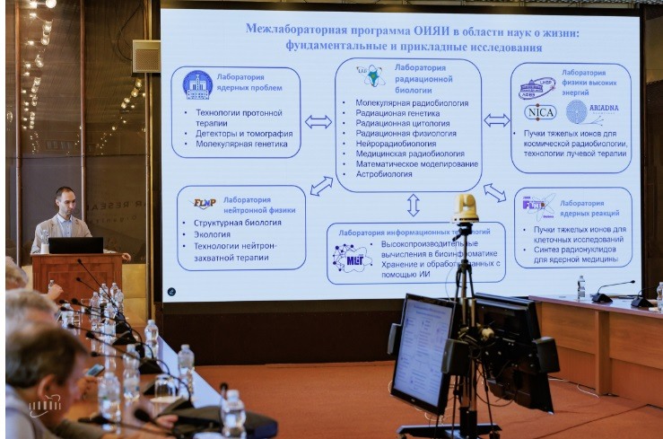 Александр Бугай провел краткий экскурс в историю развития радиобиологических исследований в ОИЯИ. В 1959 году первые биологические эксперименты были проведены на синхроциклотроне в ЛЯП. В 1967 году на базе синхроциклотрона стали проводиться сеансы протонной терапии онкологических пациентов. В 1978 году в Лаборатории ядерных проблем ОИЯИ был создан сектор биологических исследований, в 1988 он был преобразован в отдел. В 1995 году было основано Отделение радиационных и радиологических исследований ОИЯИ. Наконец, в 2005 году, когда данная область науки стала играть все более значимую роль в программе Института, была создана Лаборатория радиационной биологии.