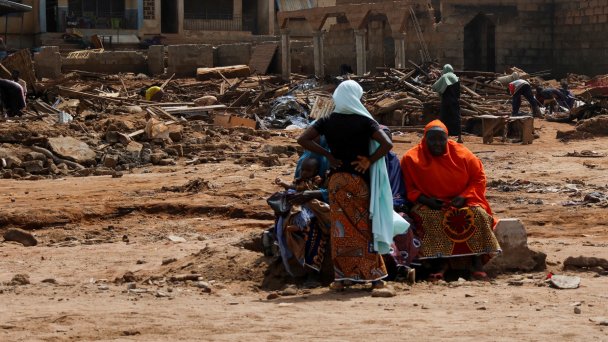 Люди рядом с обрушившимися домами после наводнения, унесшего жизни 151 человека и вынудившего несколько тысяч покинуть свои дома. Нигерия, 31 мая 2025 года (Фото Reuters)