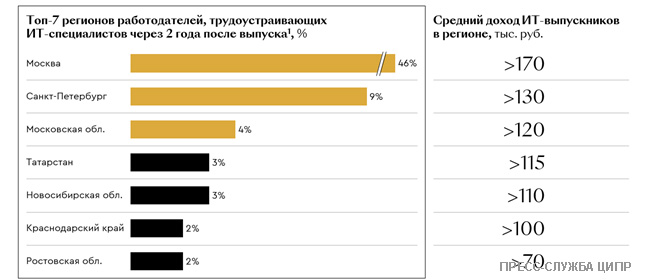 Несмотря на рост числа поступивших, темпы расширения ИТ-программ в вузах замедлились: если с 2017 по 2022 г. ежегодно добавлялось по 5–7 тыс. новых мест, то в 2024 г. — число мест увеличилось всего на тысячу. Традиционно более 60% выпускников устраиваются в крупнейшие города страны — Москву, Московскую область и Санкт-Петербург. Также в топ-7 регионов по числу трудоустроенных ИТ-выпускников входят Татарстан, Новосибирская область и Краснодарский край.