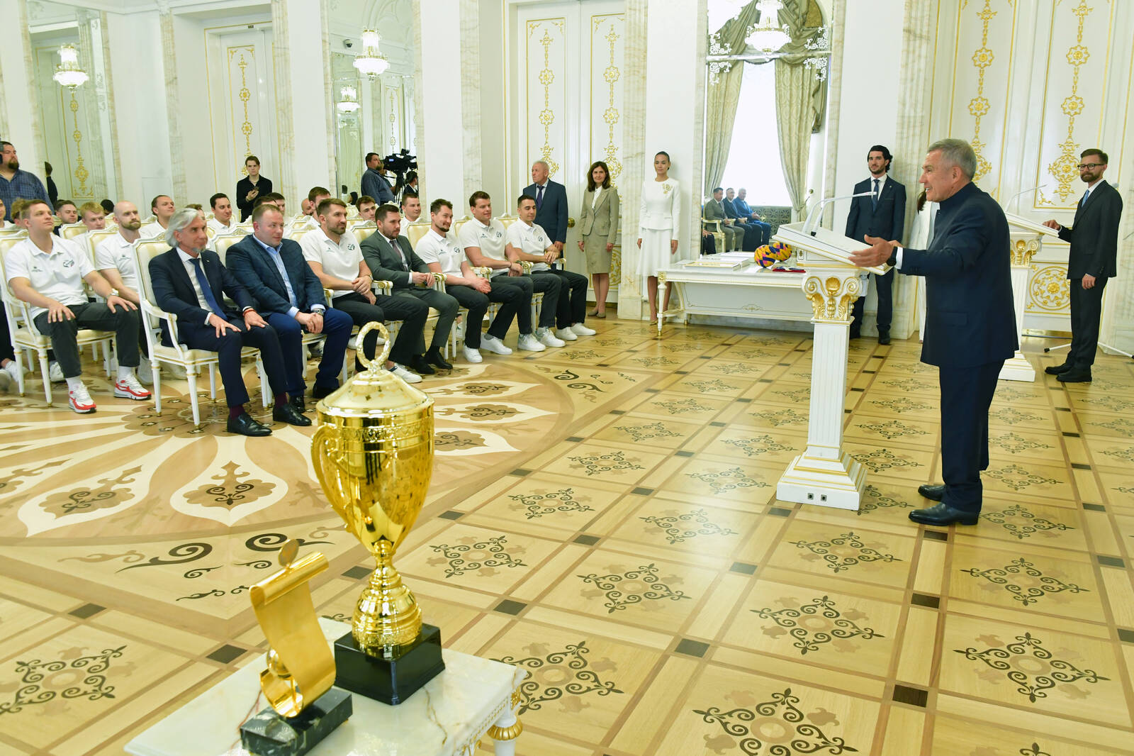 Раис РТ поблагодарил игроков, тренерский состав, а также президента клуба Ирека Зиннурова. Последний сказал, что без поддержки руководства клуб не смог бы добиться таких результатов. Он также вручил Минниханову мяч.