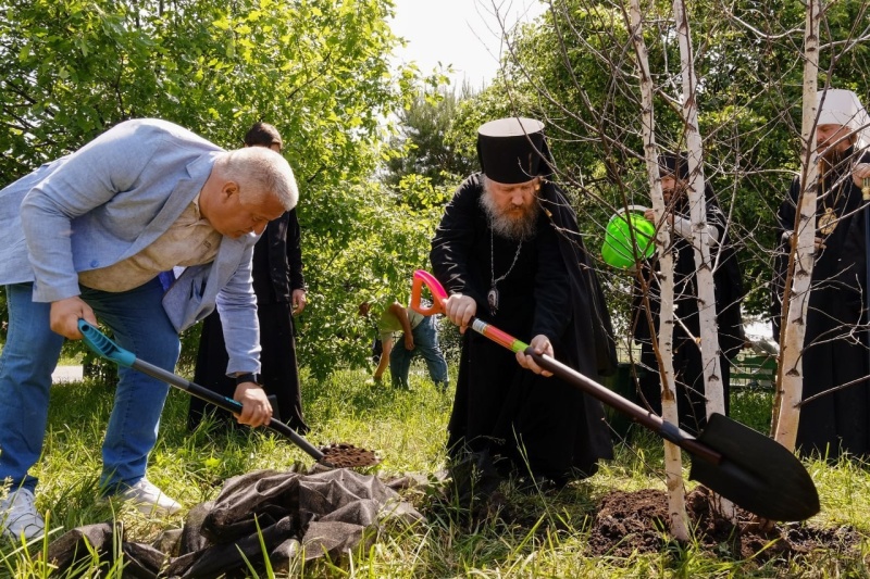 После службы архиереи Челябинской митрополии и мэр Троицка Дмитрий Гатов высадили березы на аллее возле Свято-Троицкого кафедрального собора.