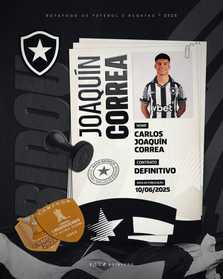 Пресс-служба «Ботафого» объявила о трансфере полузащитника «Интера» Хоакина Корреа.