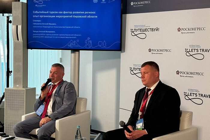 Делегация Кировской области, возглавляемая заместителем председателя правительства Кировской области Евгением Габсаматовым и руководителем Центра развития туризма Кировской области и Дирекции по организации мероприятий Алексеем Чепцовым, работает на международном туристическом форуме «Путешествуй!», который проводится в рамках национального проекта «Туризм и гостеприимство». Регион участвует в деловой программе форума, в рамках которой Кировская область рассказала о мероприятиях событийного туризма.
