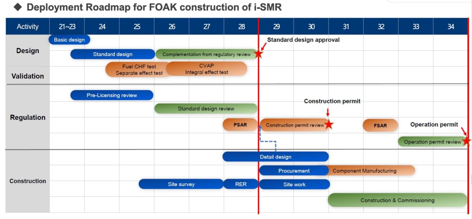 План работ по созданию головного модуля i-SMR приведен ниже. Предполагается получить одобрение стандартного проекта к 2029 году, приступить к строительству в 2031 году и пустить головной модуль до 2035 года.